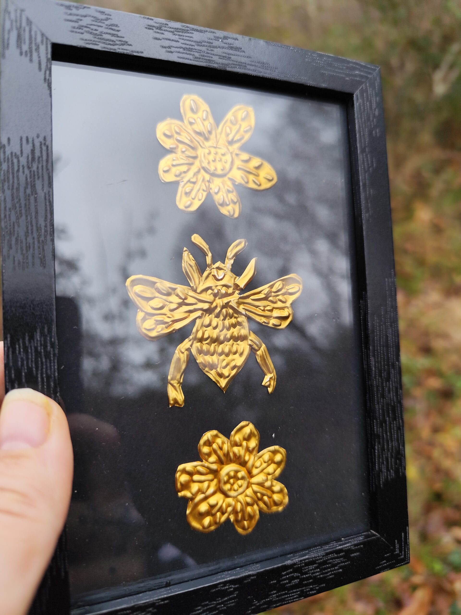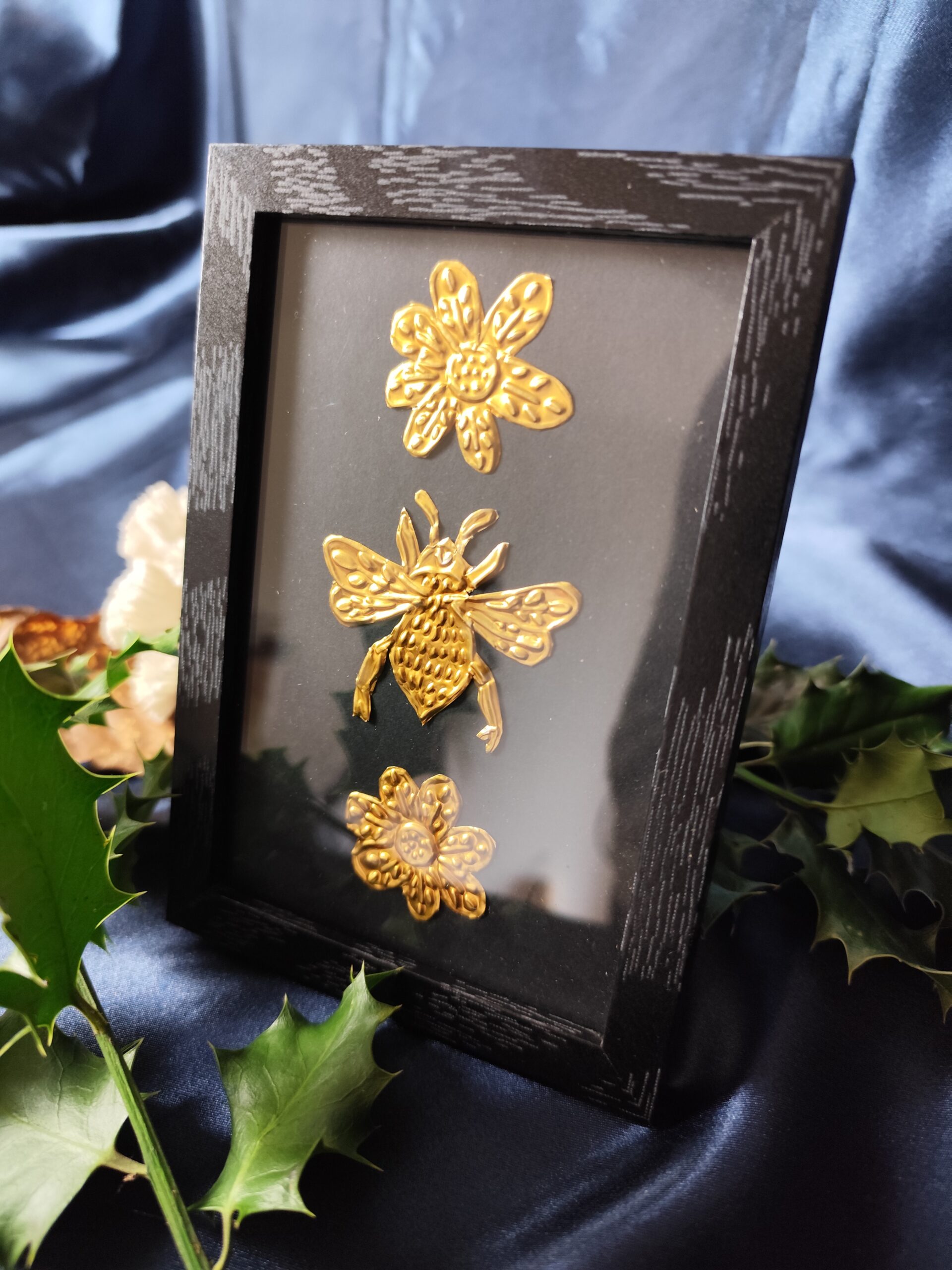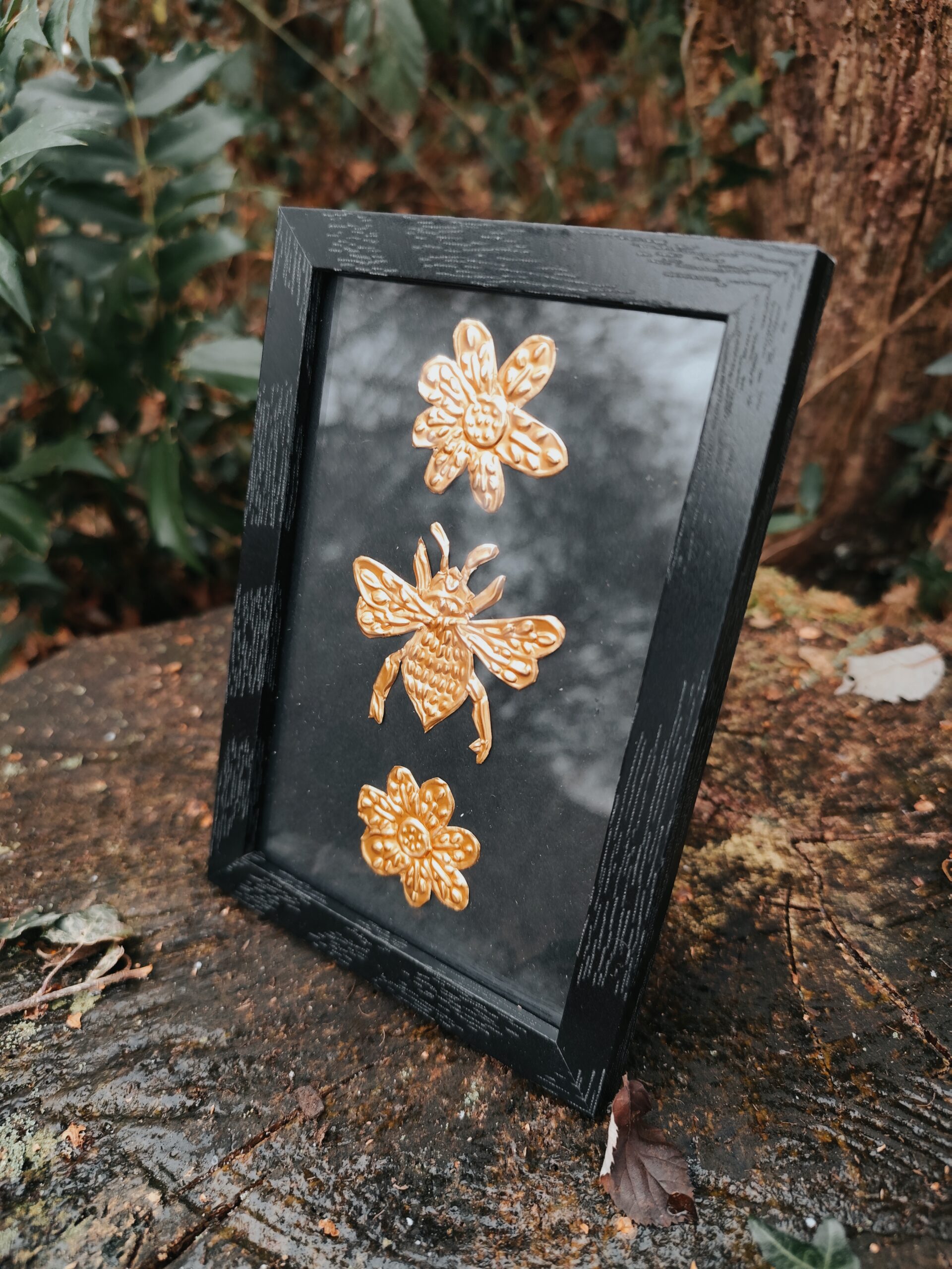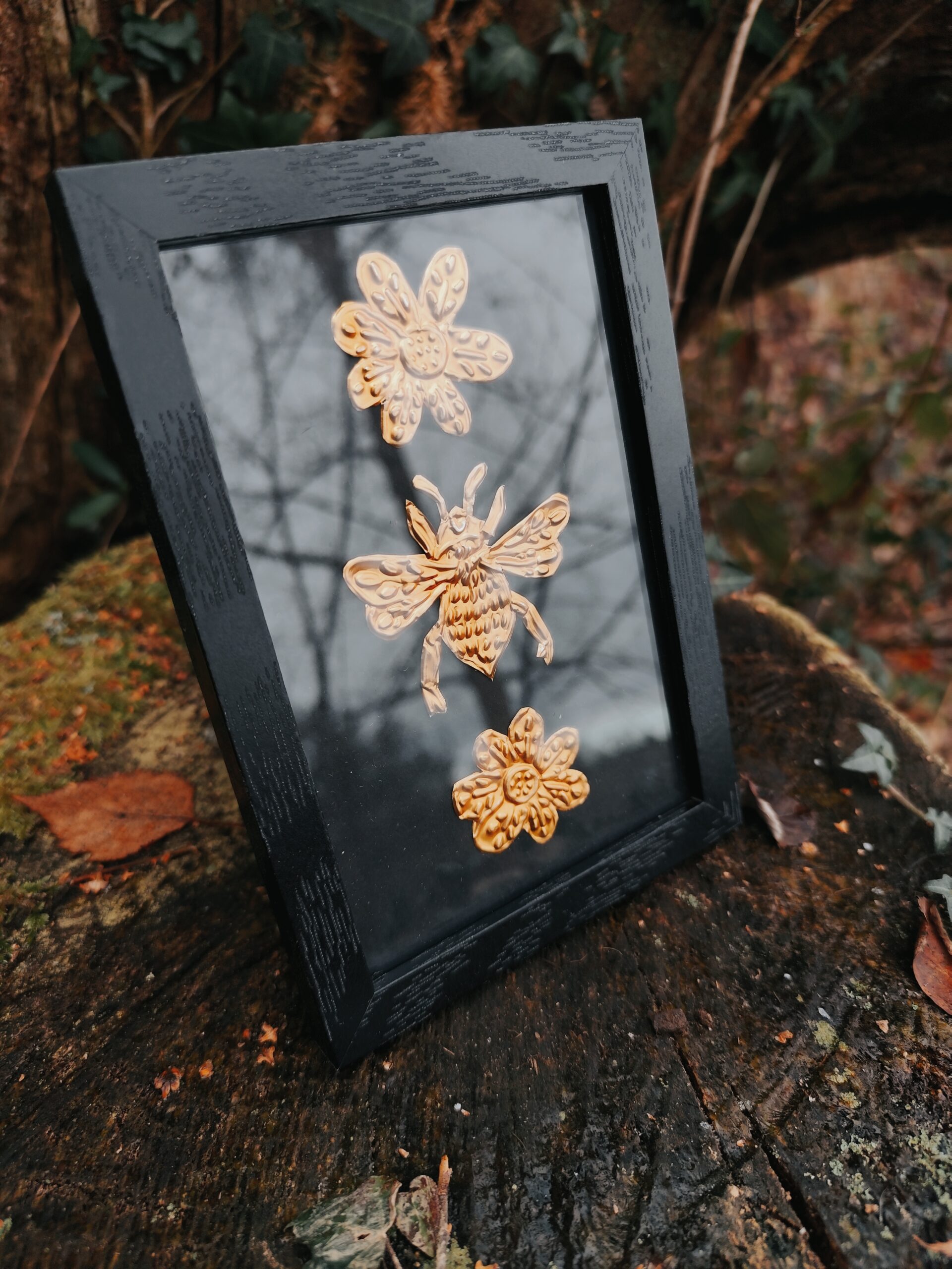 L’Abeille est une illustration réalisée en métal repoussé à la main, puis mise sous cadre pour pouvoir être posée ou accrochée facilement chez toi, dans un endroit qui te ressemble, sur ton autel ou dans ton cabinet de curiosité. Chaque pièce est façonnée dans mon atelier, une à une, avec le temps et l’attention que demande ce travail de matière.