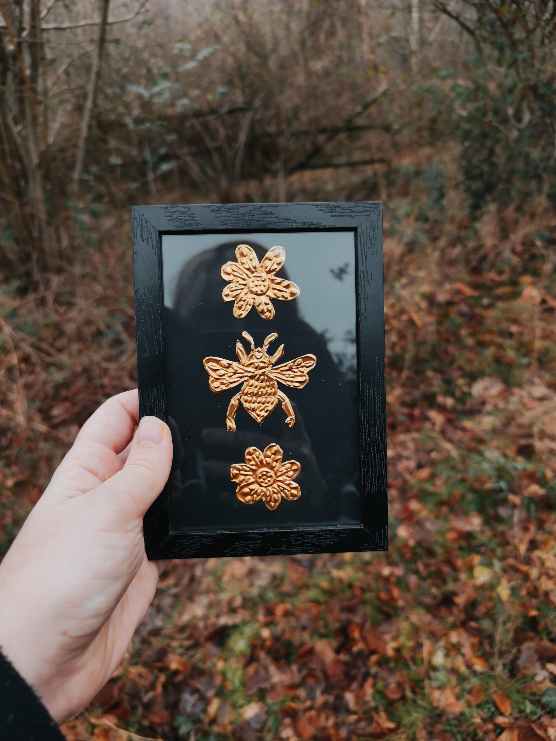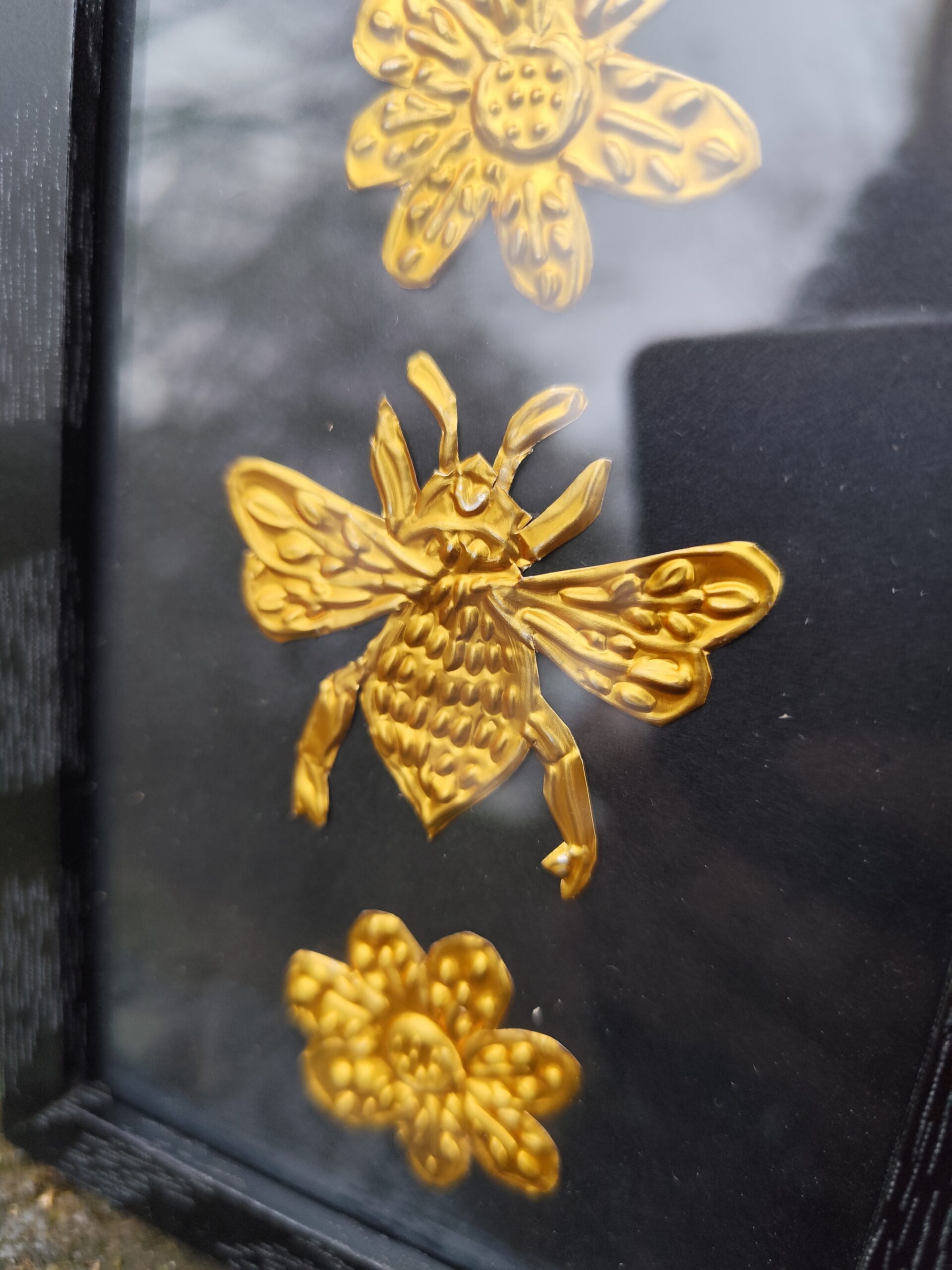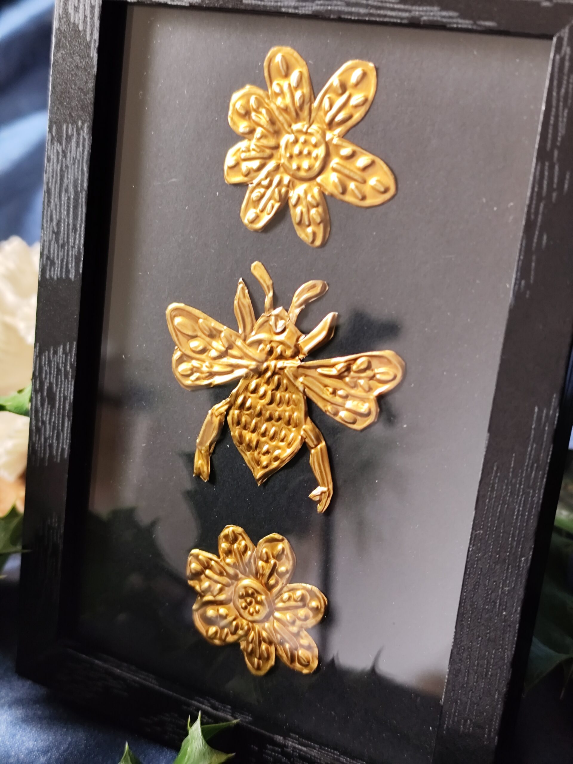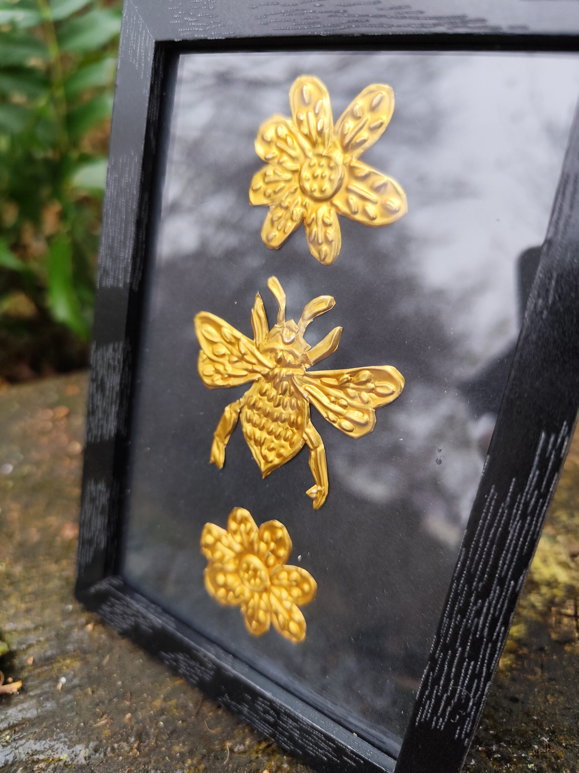 L’Abeille est une illustration réalisée en métal repoussé à la main, puis mise sous cadre pour pouvoir être posée ou accrochée facilement chez toi, dans un endroit qui te ressemble, sur ton autel ou dans ton cabinet de curiosité. Chaque pièce est façonnée dans mon atelier, une à une, avec le temps et l’attention que demande ce travail de matière.