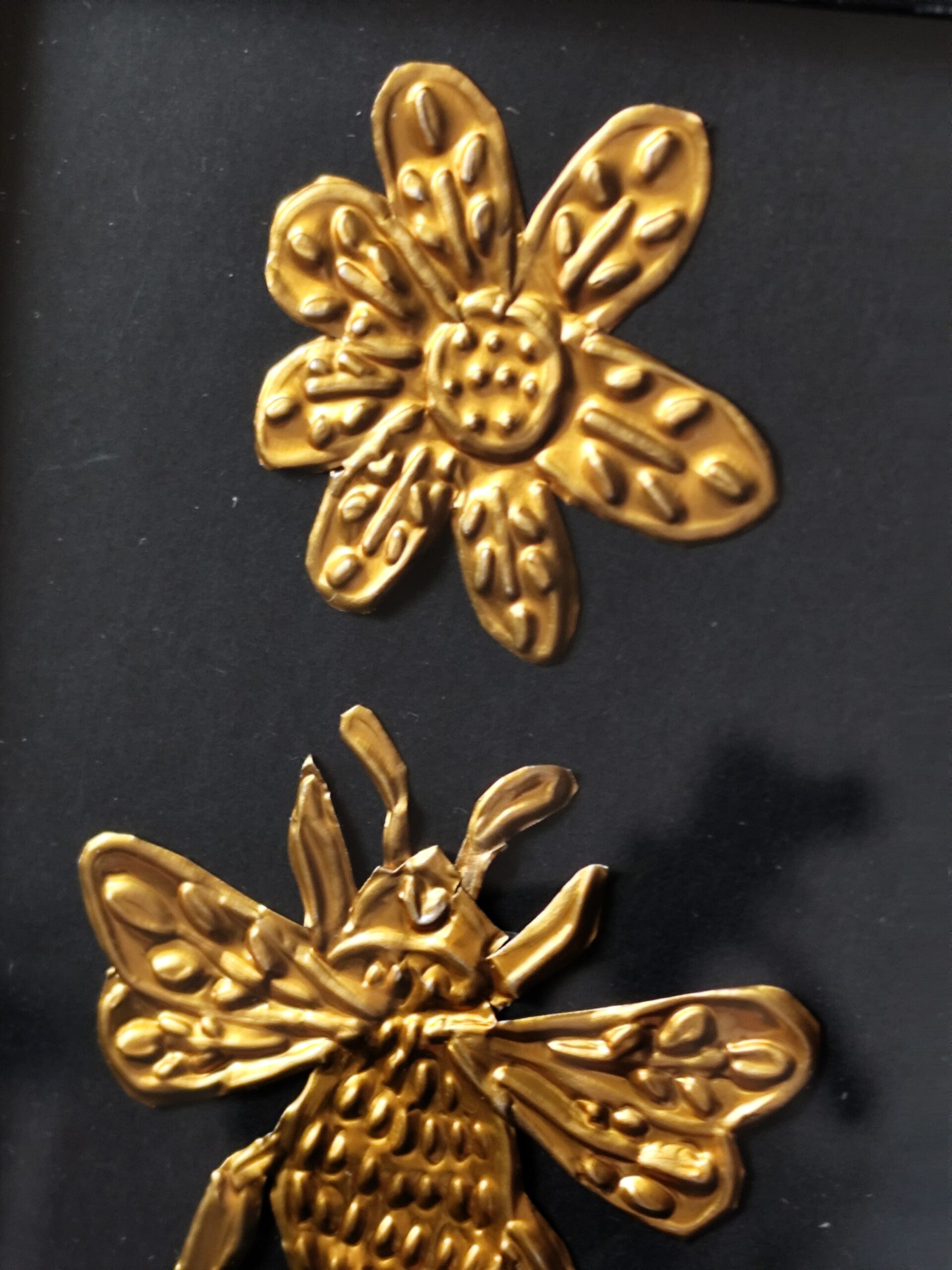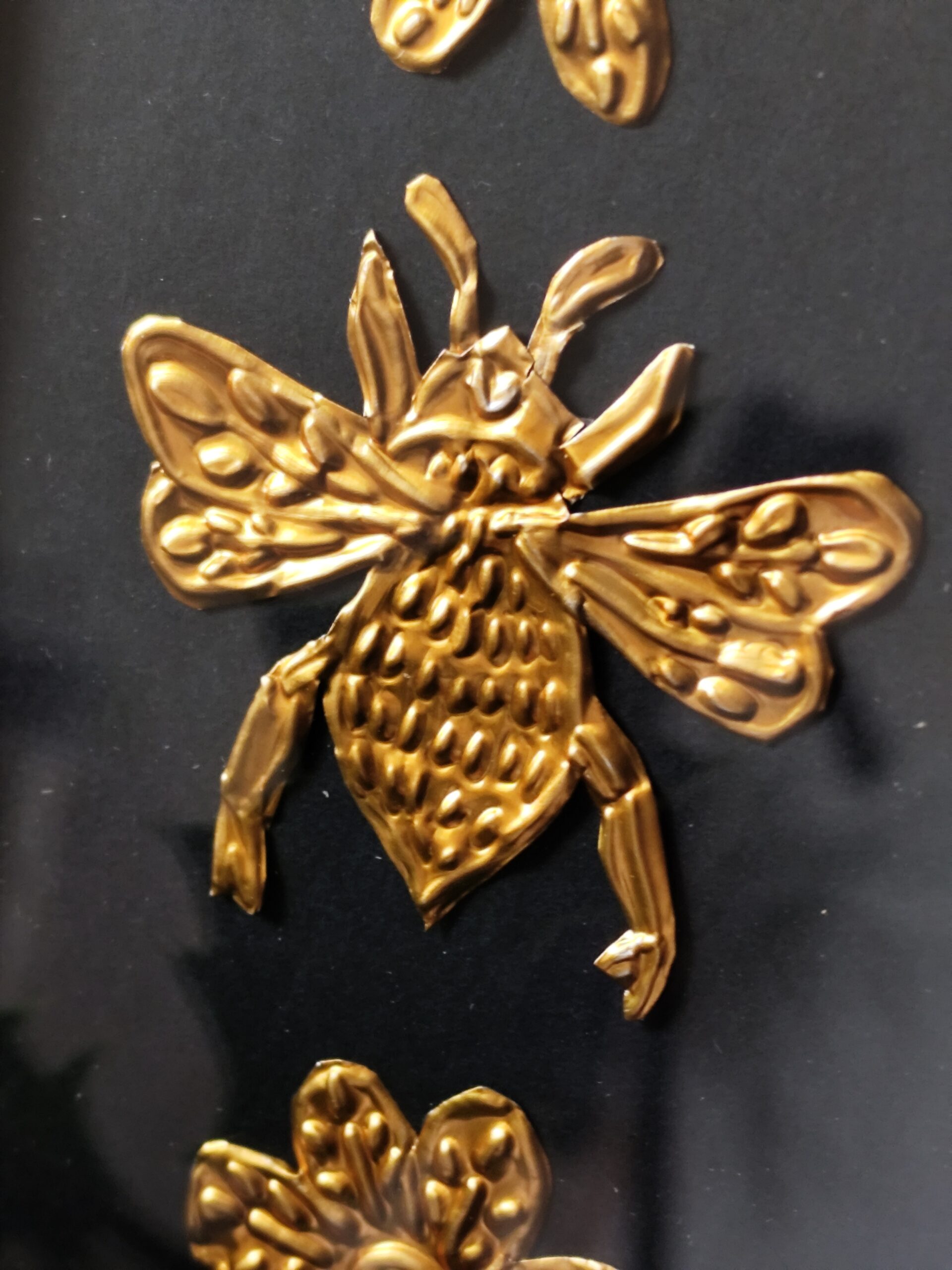 Détails Illustration : Abeille en métal repoussé à la main.