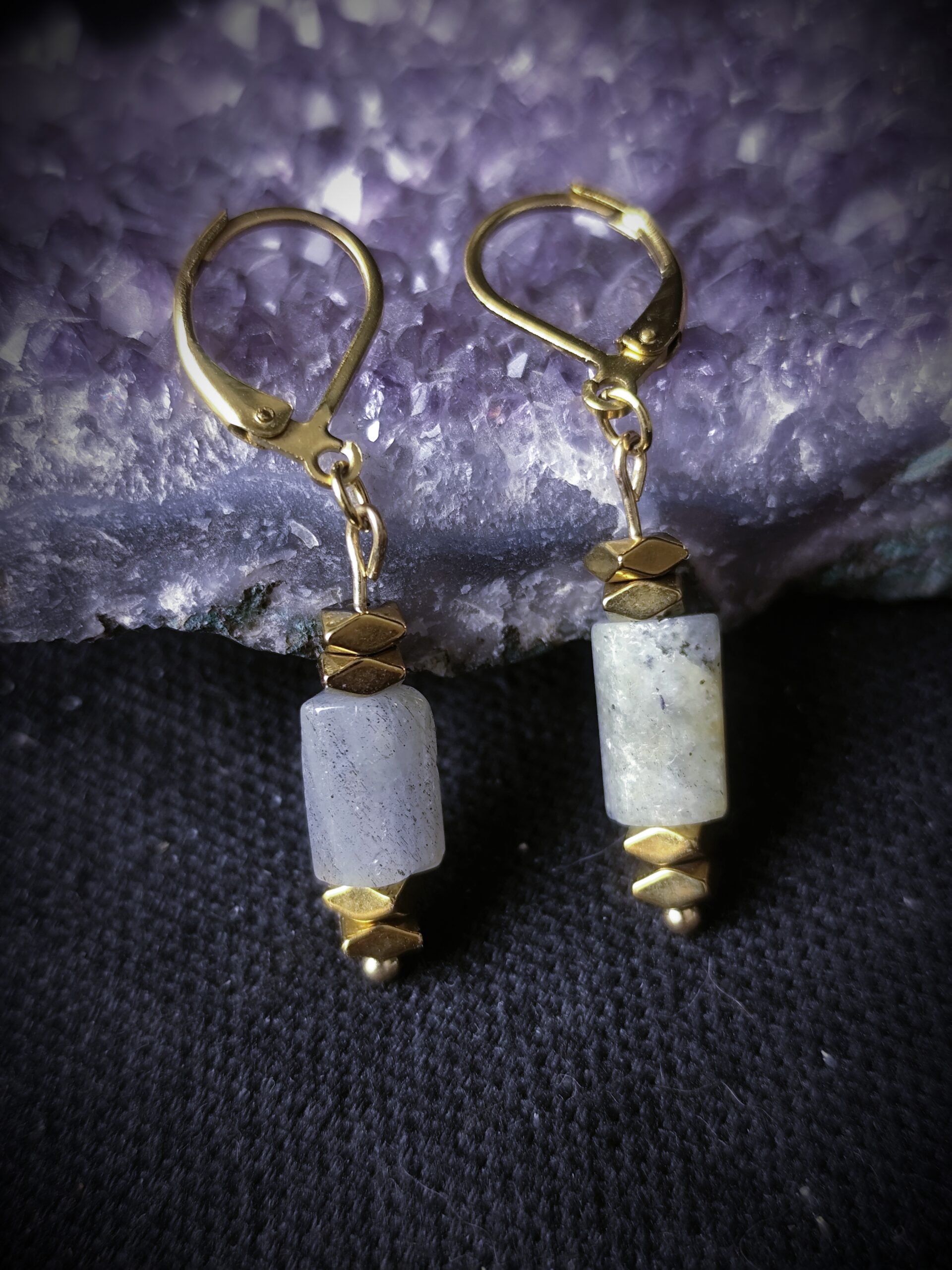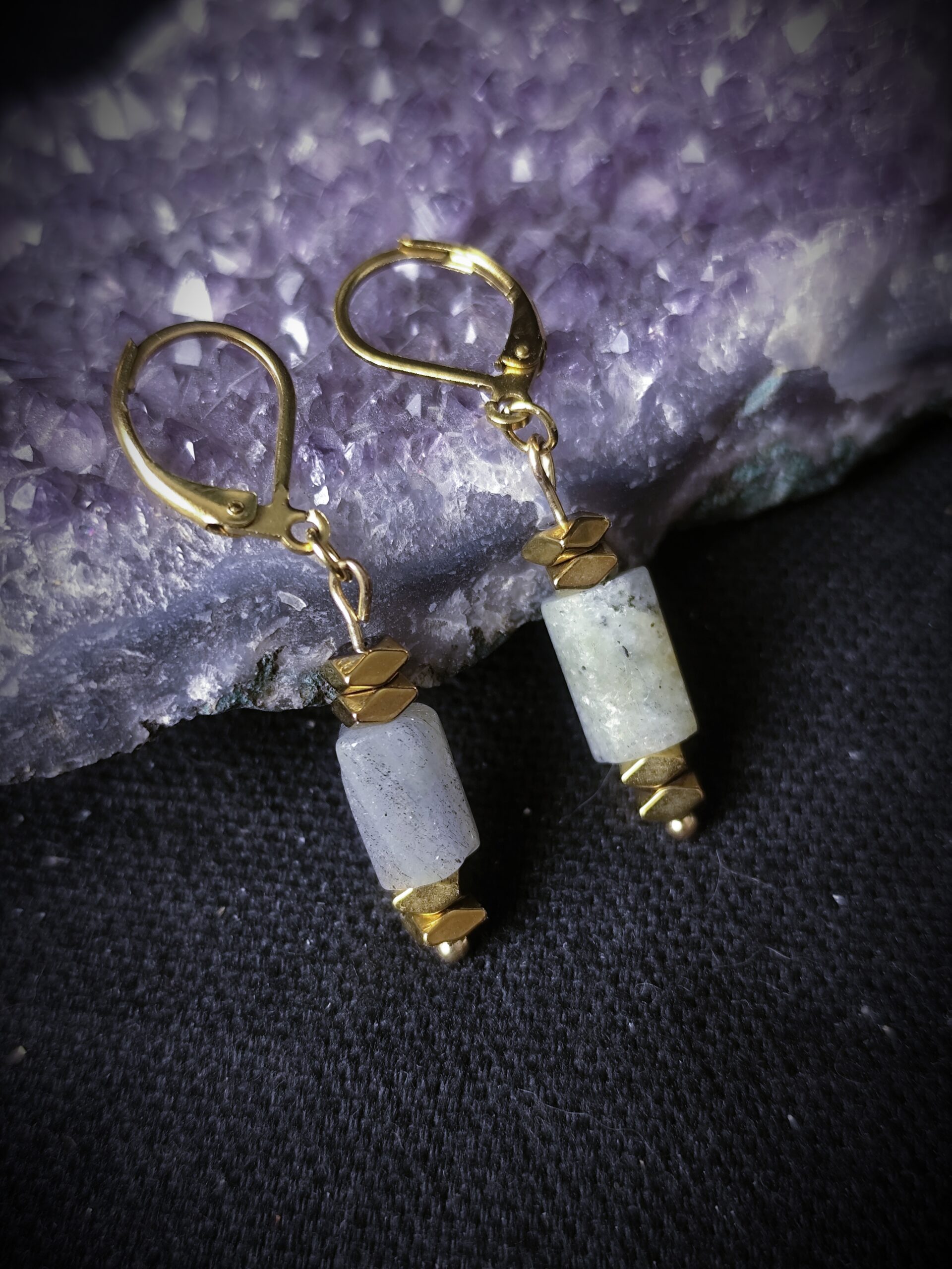 Boucles d’oreilles « Aurore » de la Collection Stanislava. Acier inoxydable doré et perle cylindrique en labradorite et hématite doré.