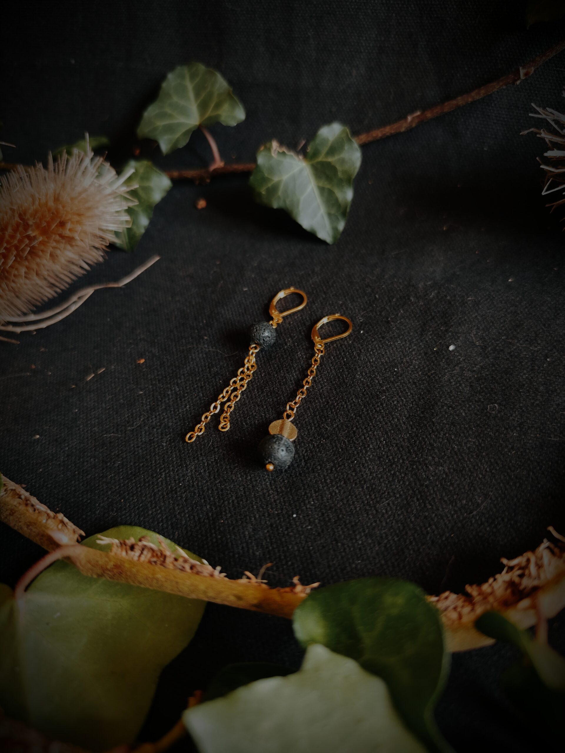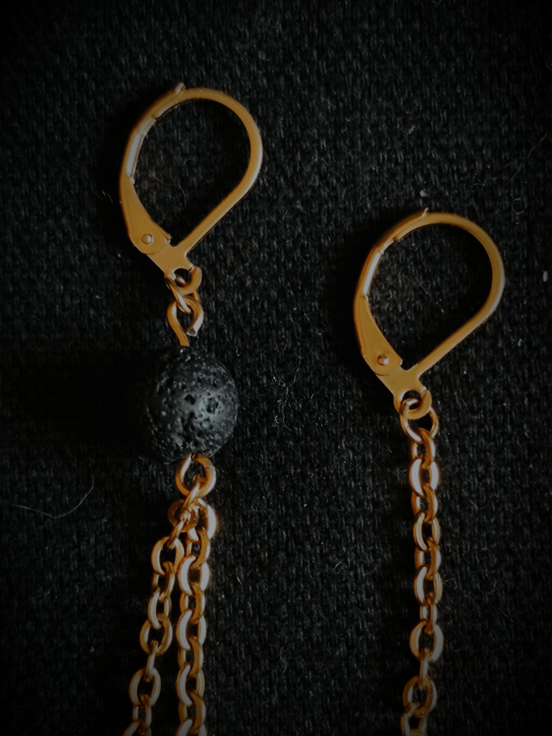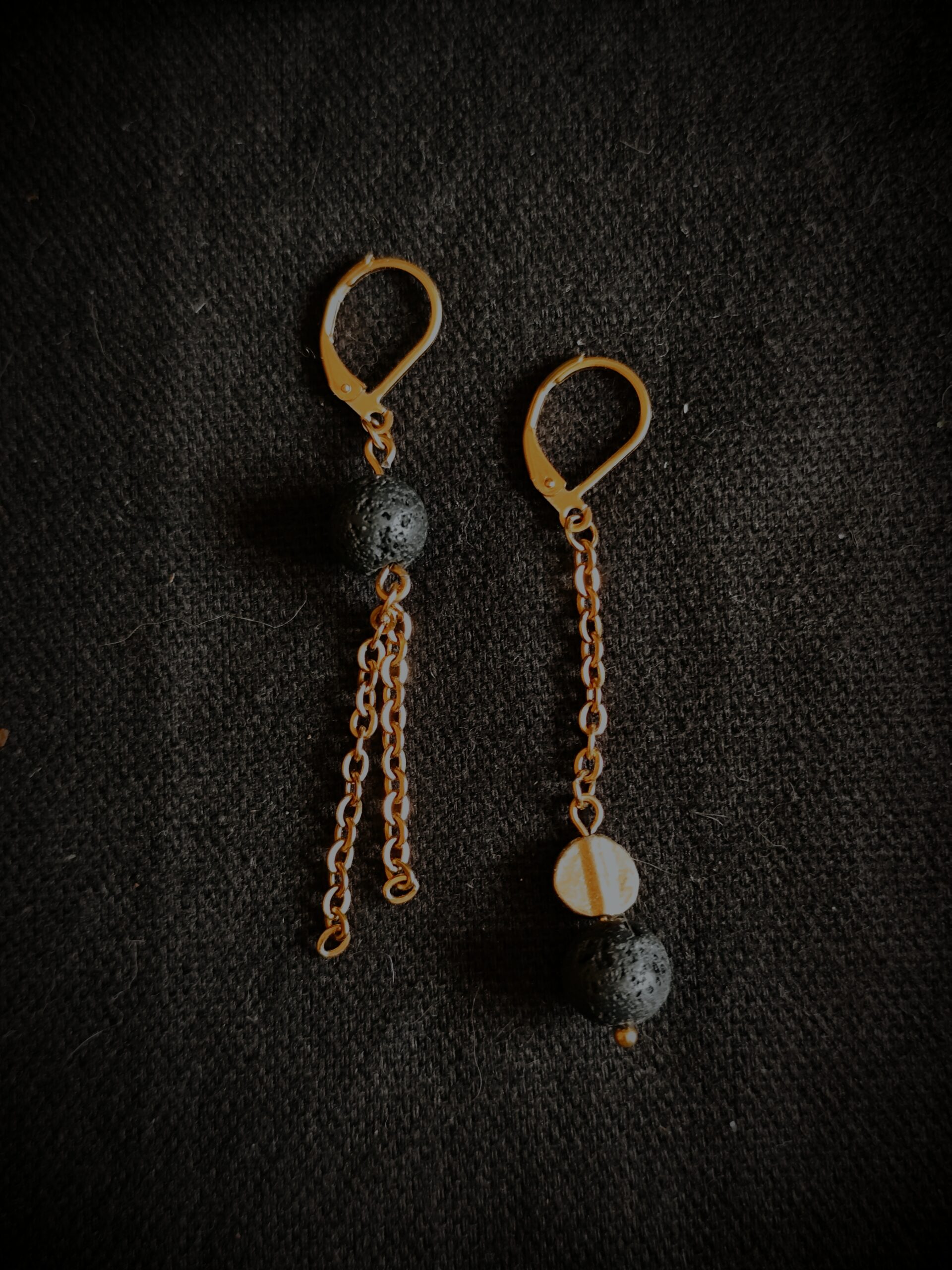 Boucles en perles de Basalte (Pierre de lave) et perles de laiton.