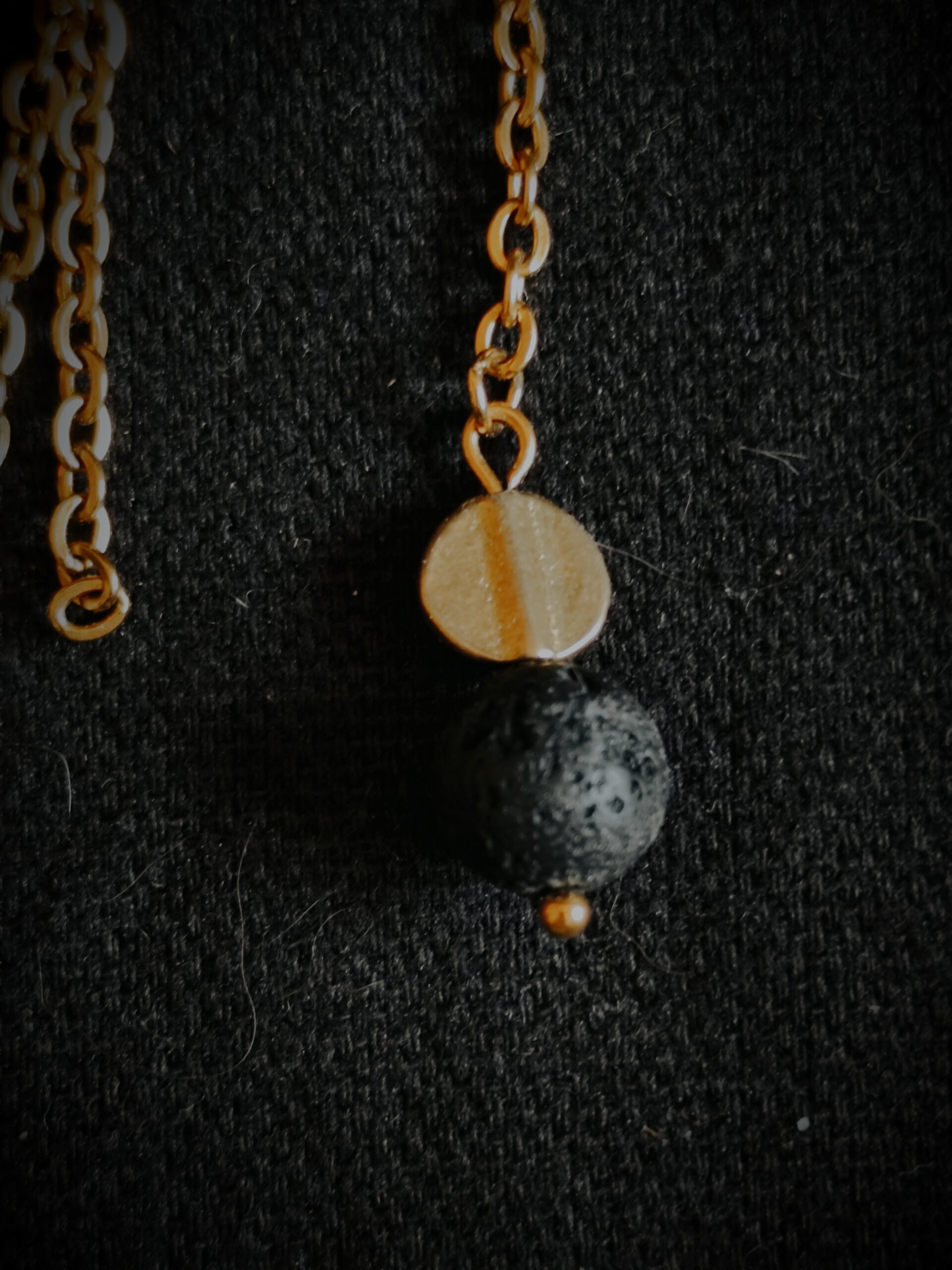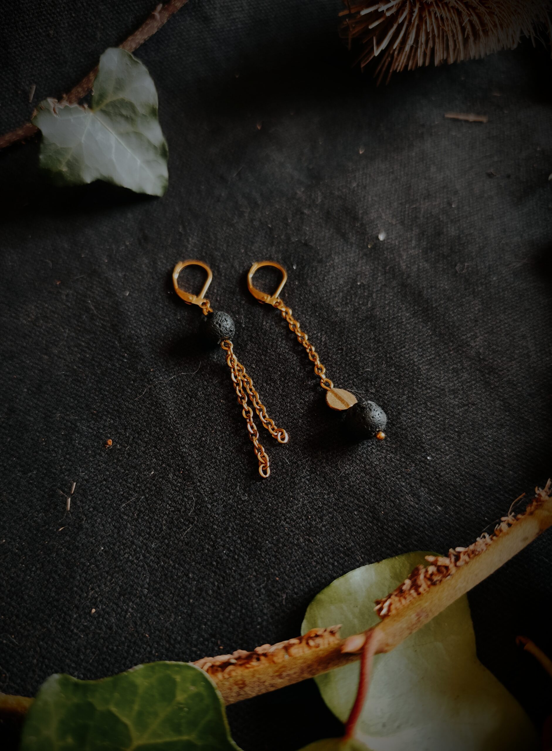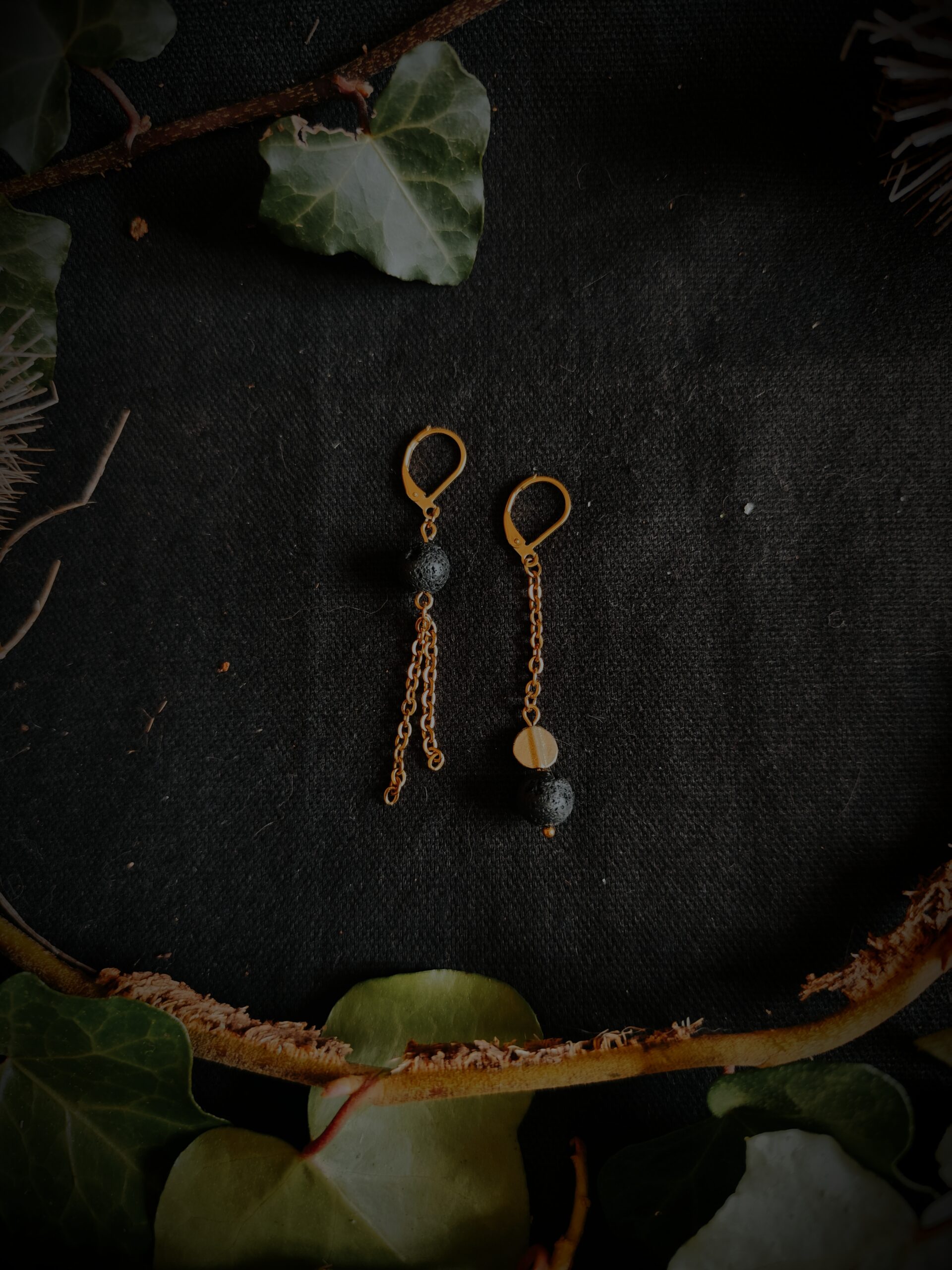 Boucles en perles de Basalte (Pierre de lave) et perles de laiton.