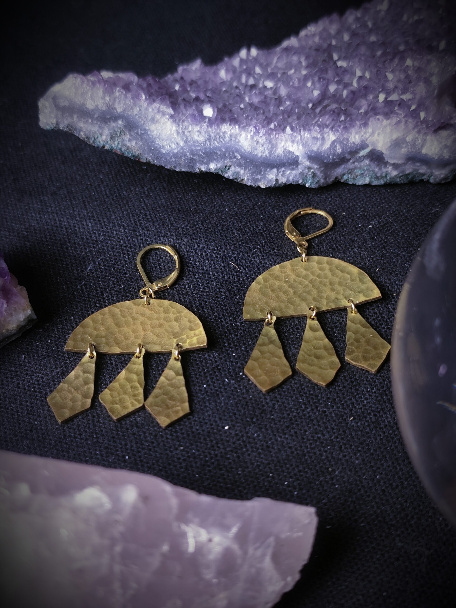 Boucles d’oreilles « Élan » de la Collection Stanislava. Laiton scié et martelé à la main avec breloques pendantes.