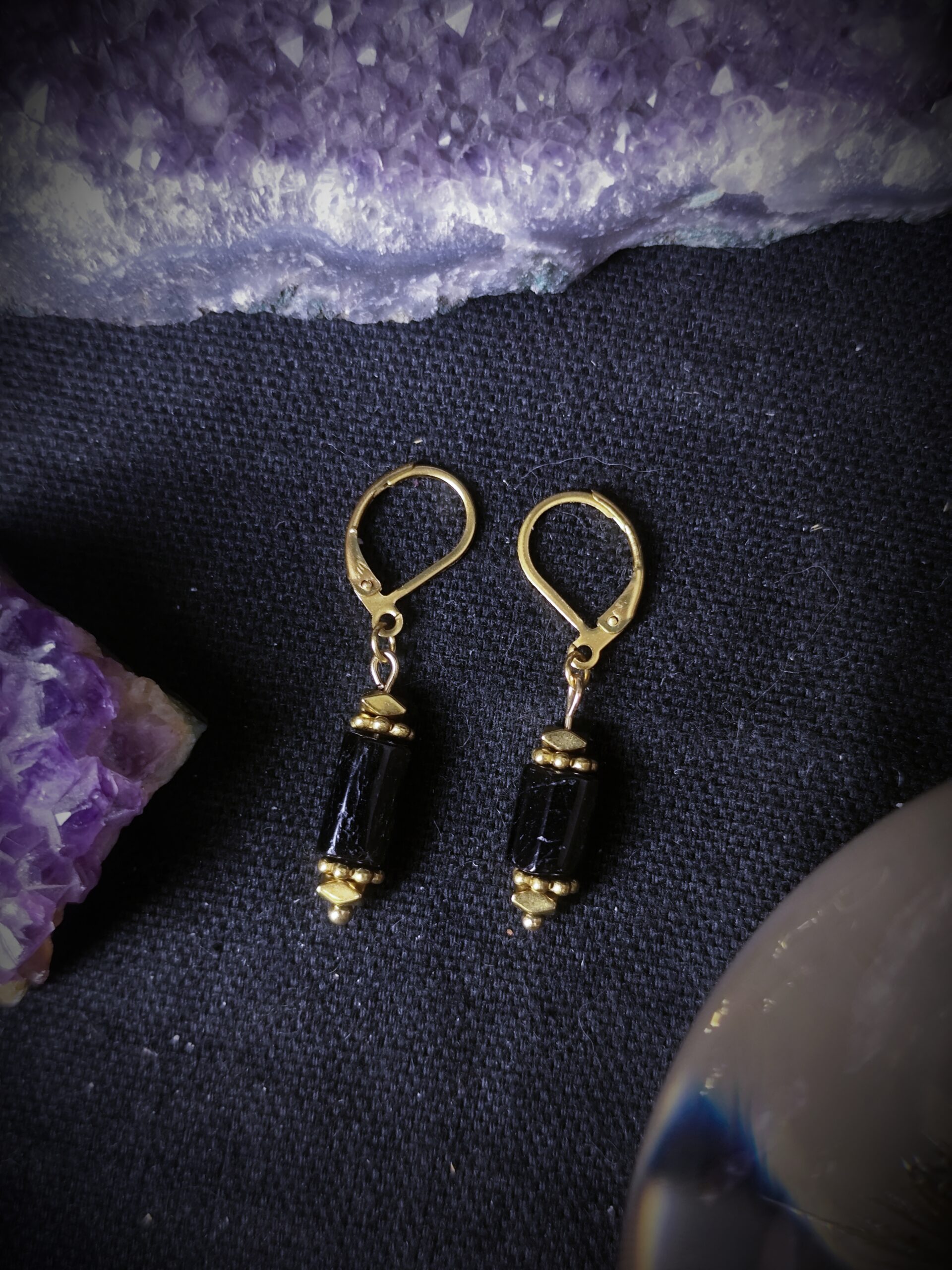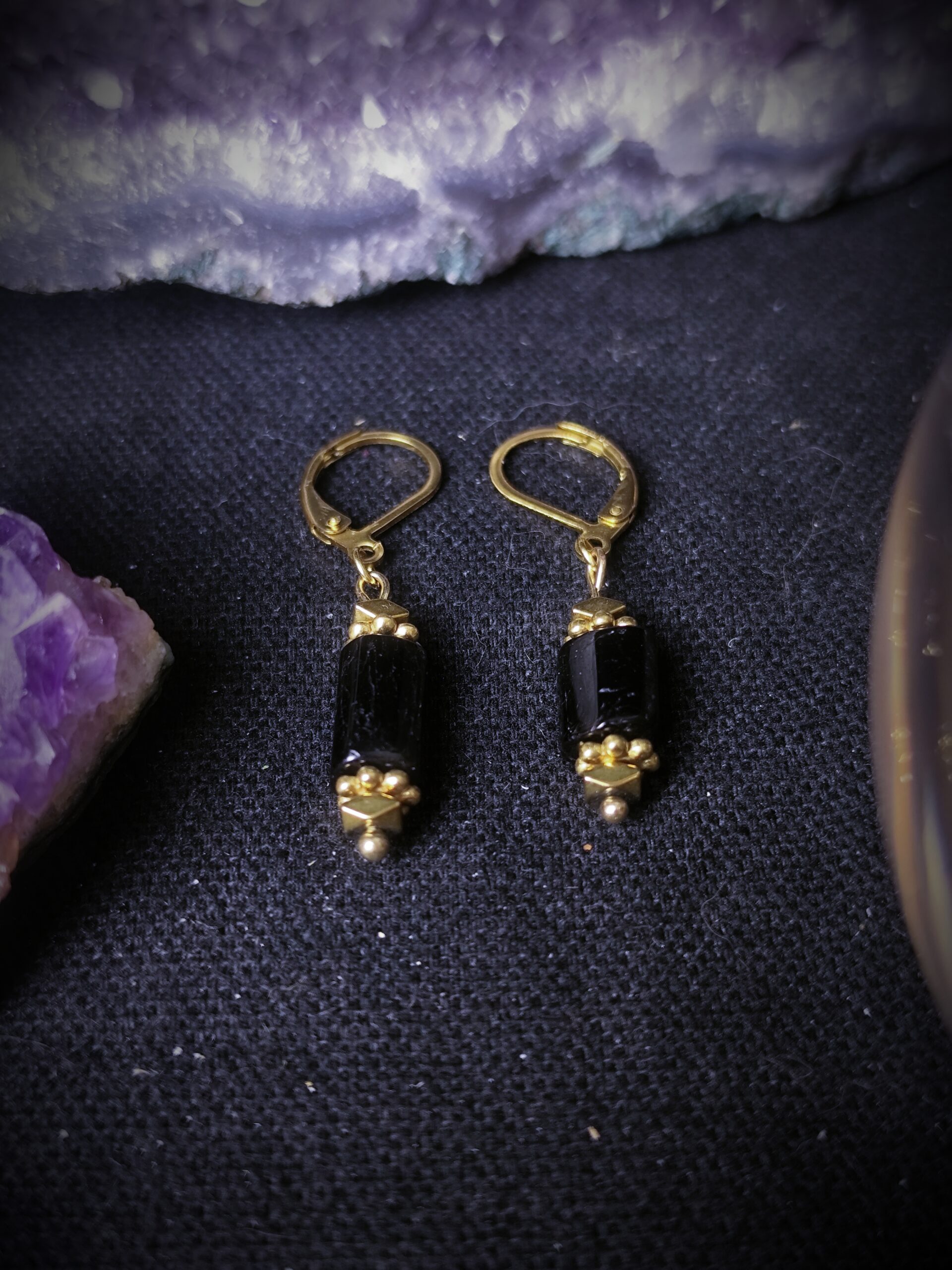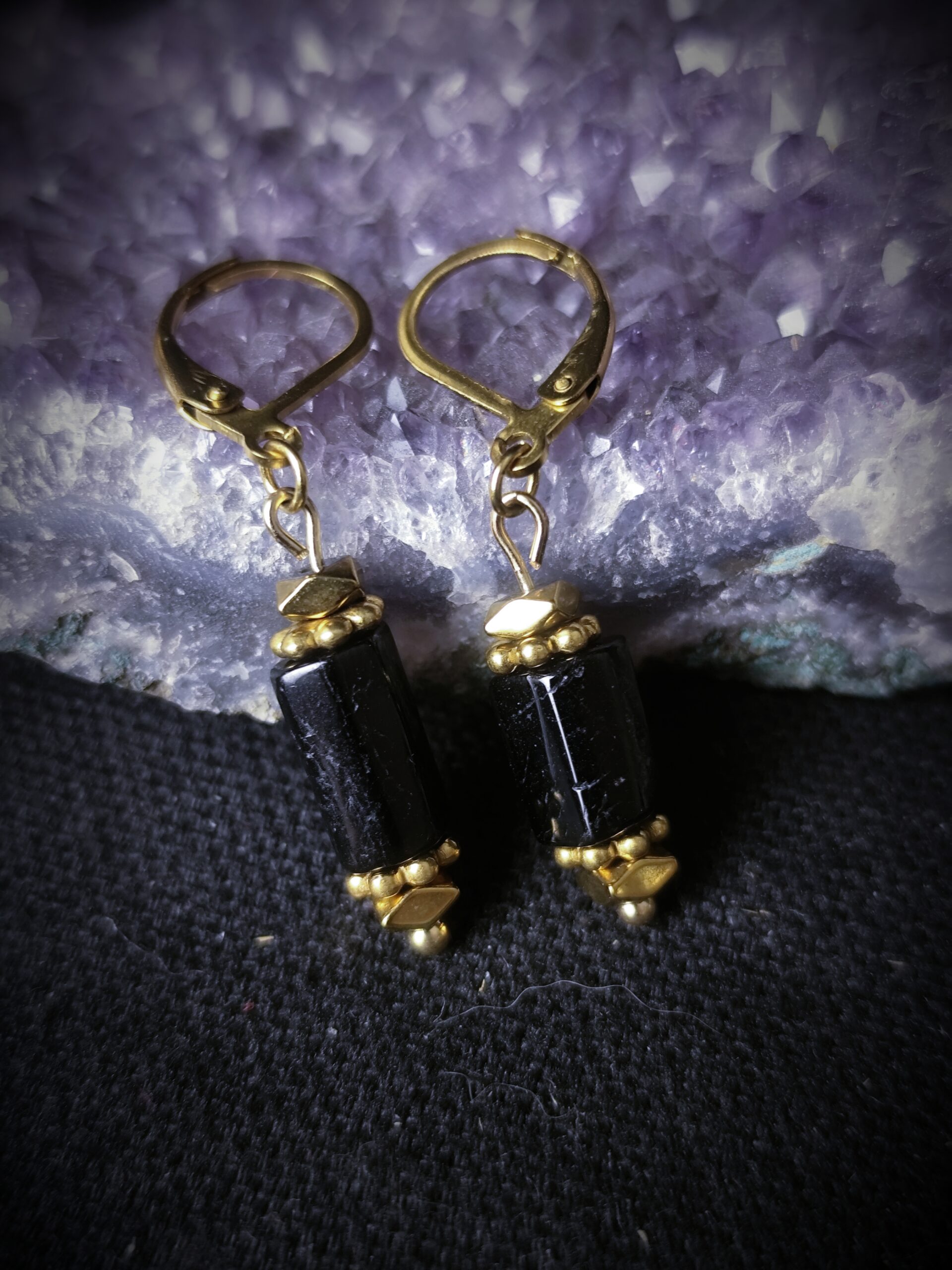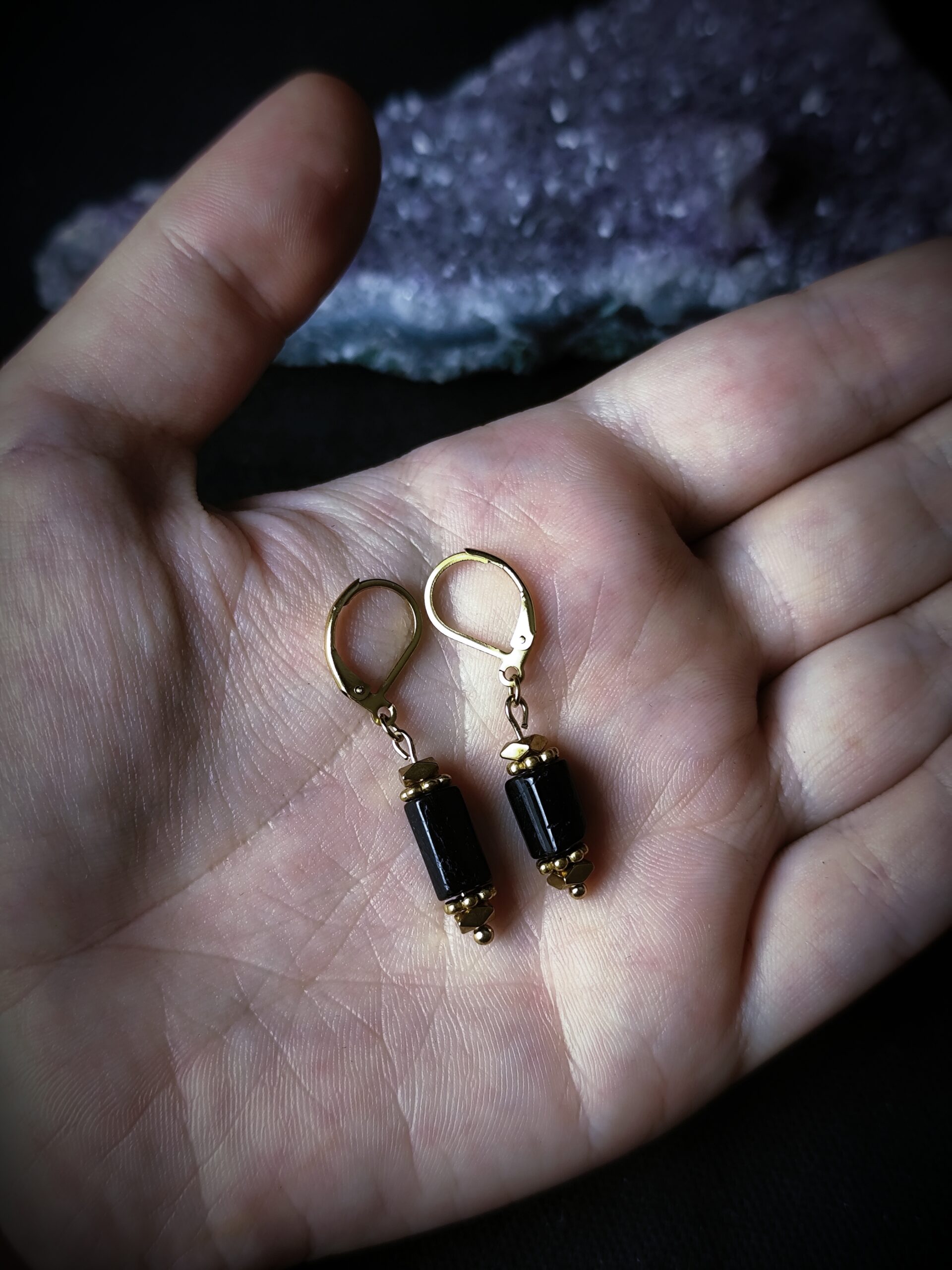 Boucles d’oreilles « Ombre » de la Collection Stanislava. Acier inoxydable doré et perle cylindrique en tourmaline noire et hématite doré.