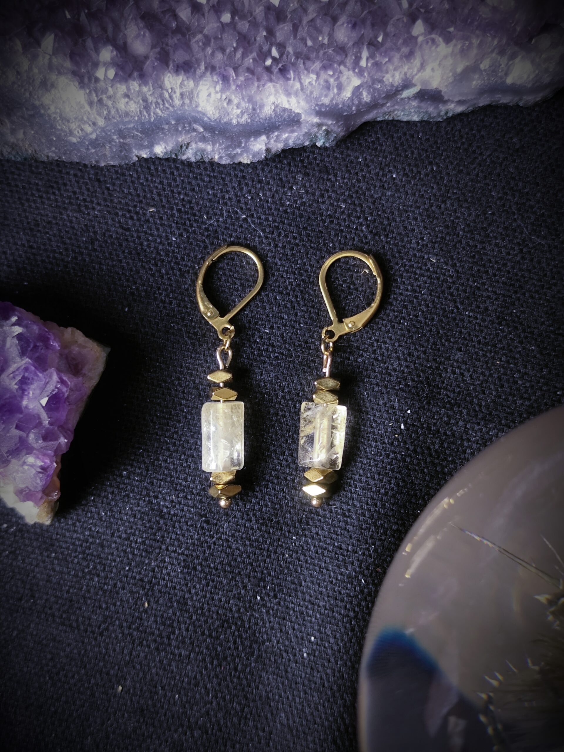 Boucles d’oreilles « Soleil » de la Collection Stanislava. Acier inoxydable doré et perle cylindrique en citrine et hématite doré.