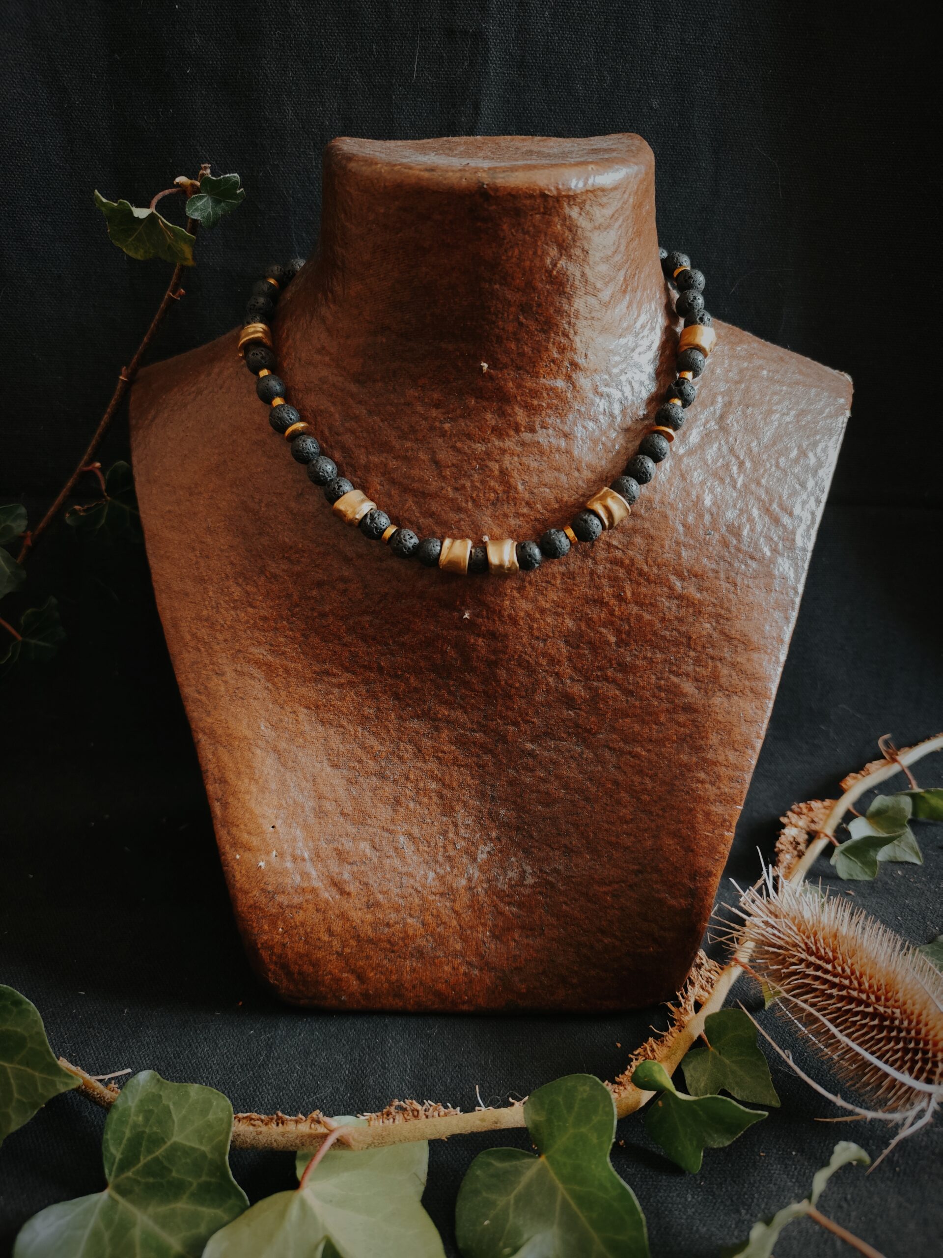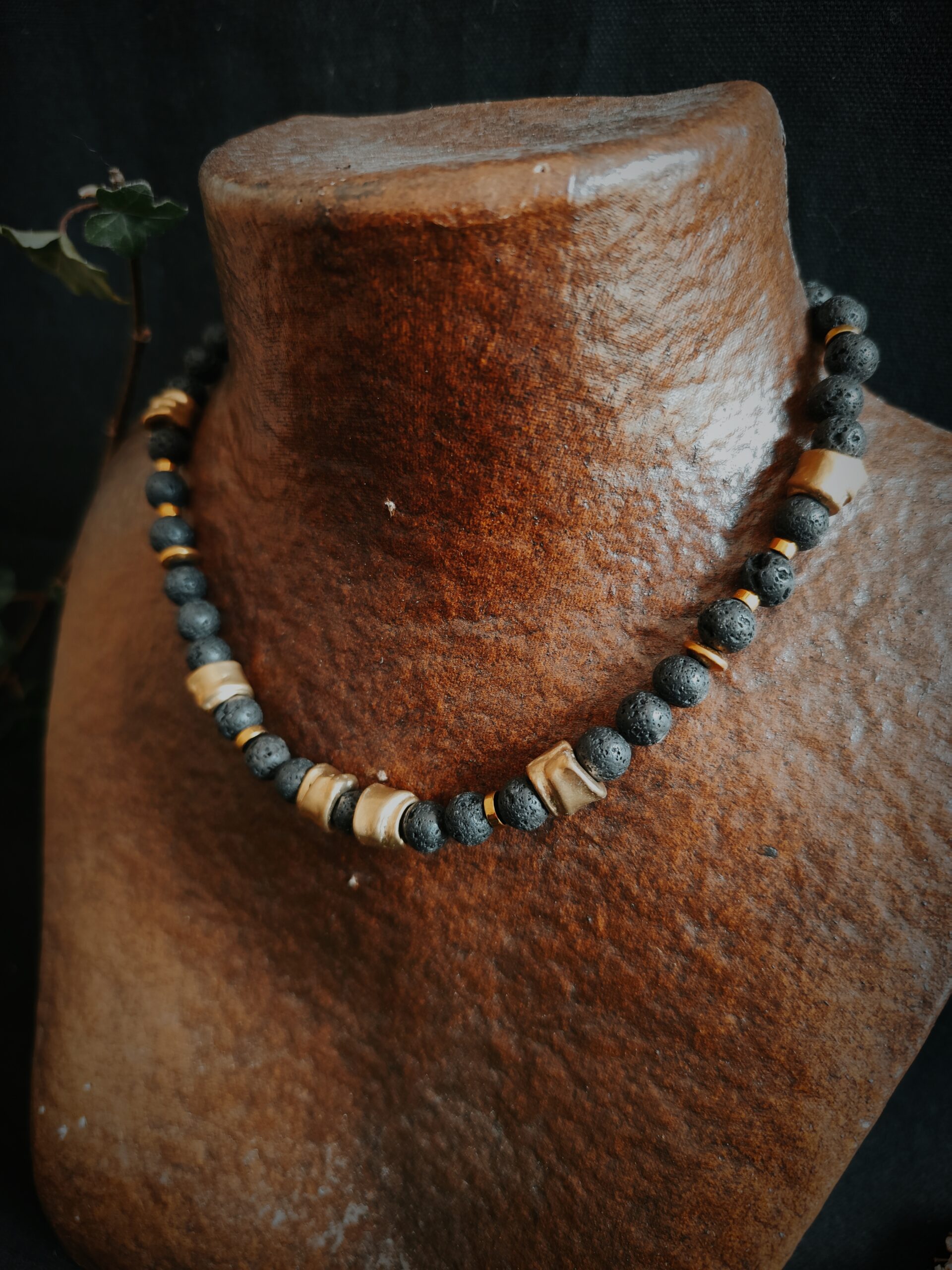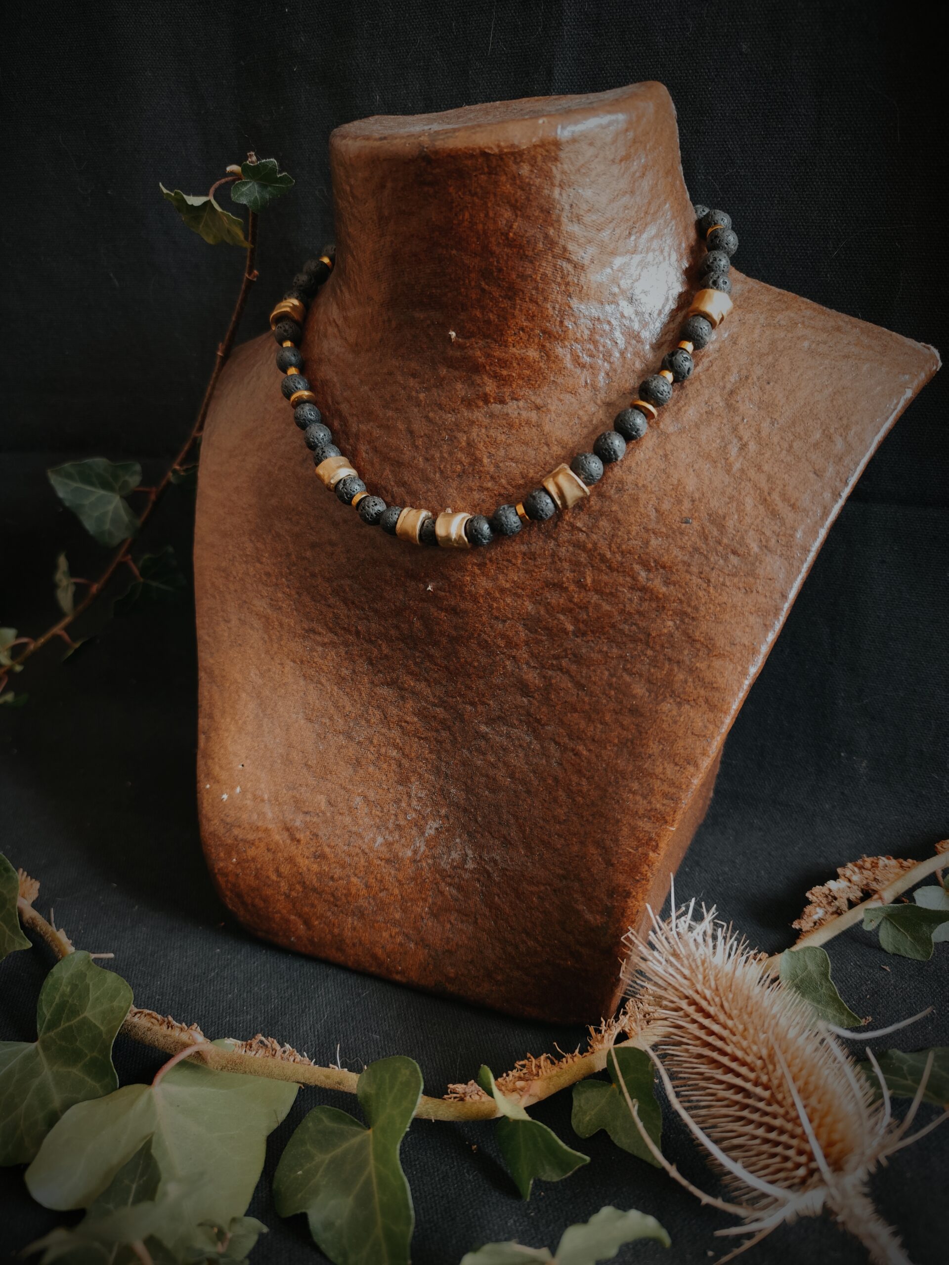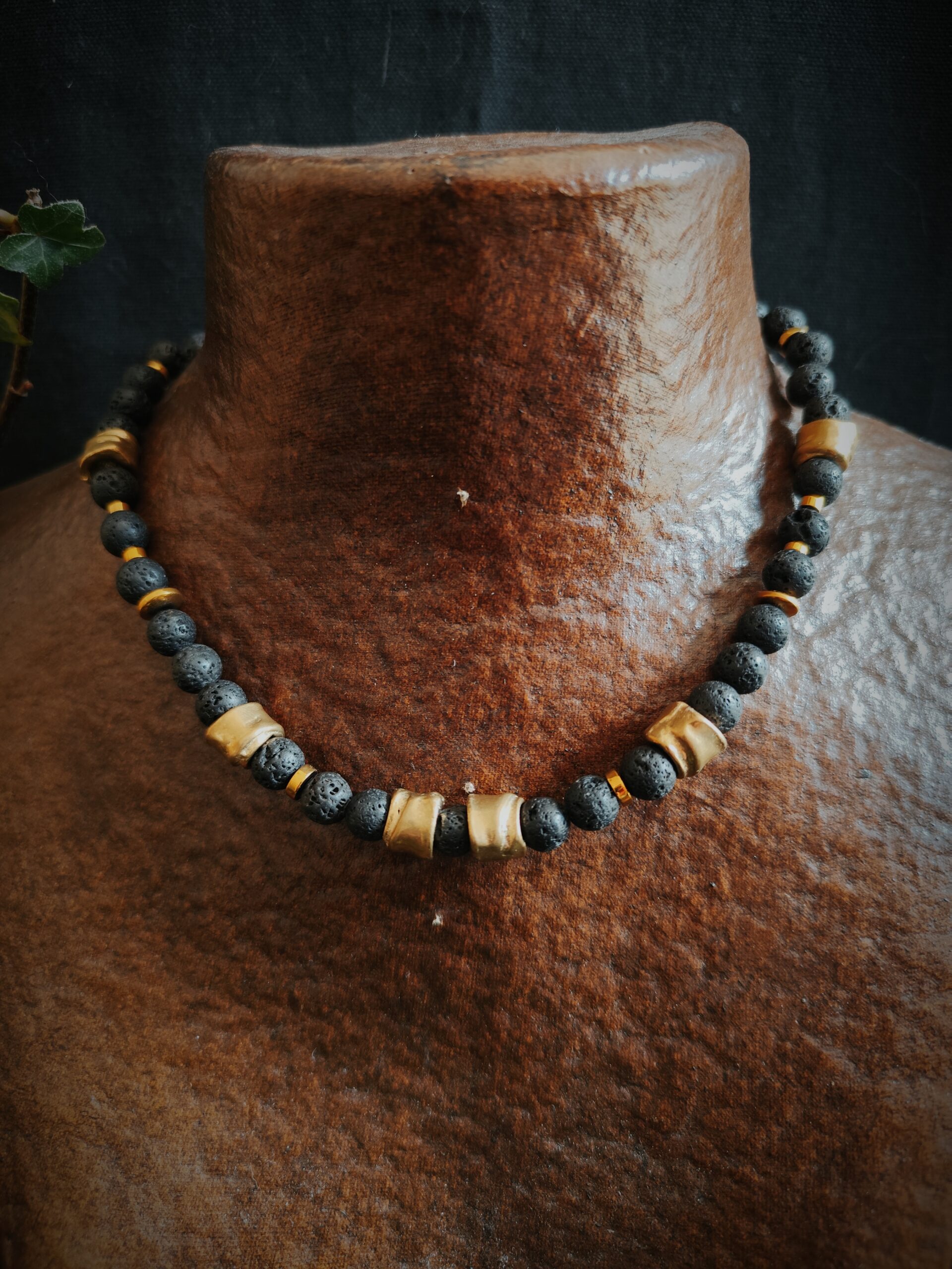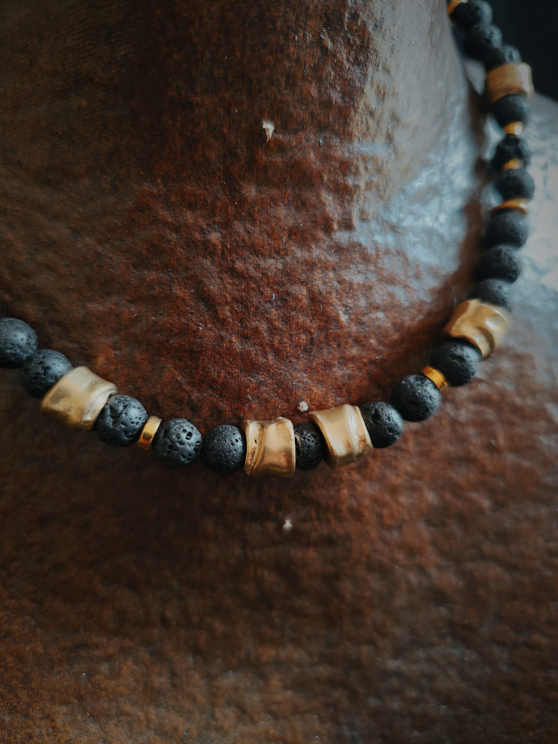 Collier en perles de Basalte (Pierre de lave), Hématite dorée et perles de laiton.