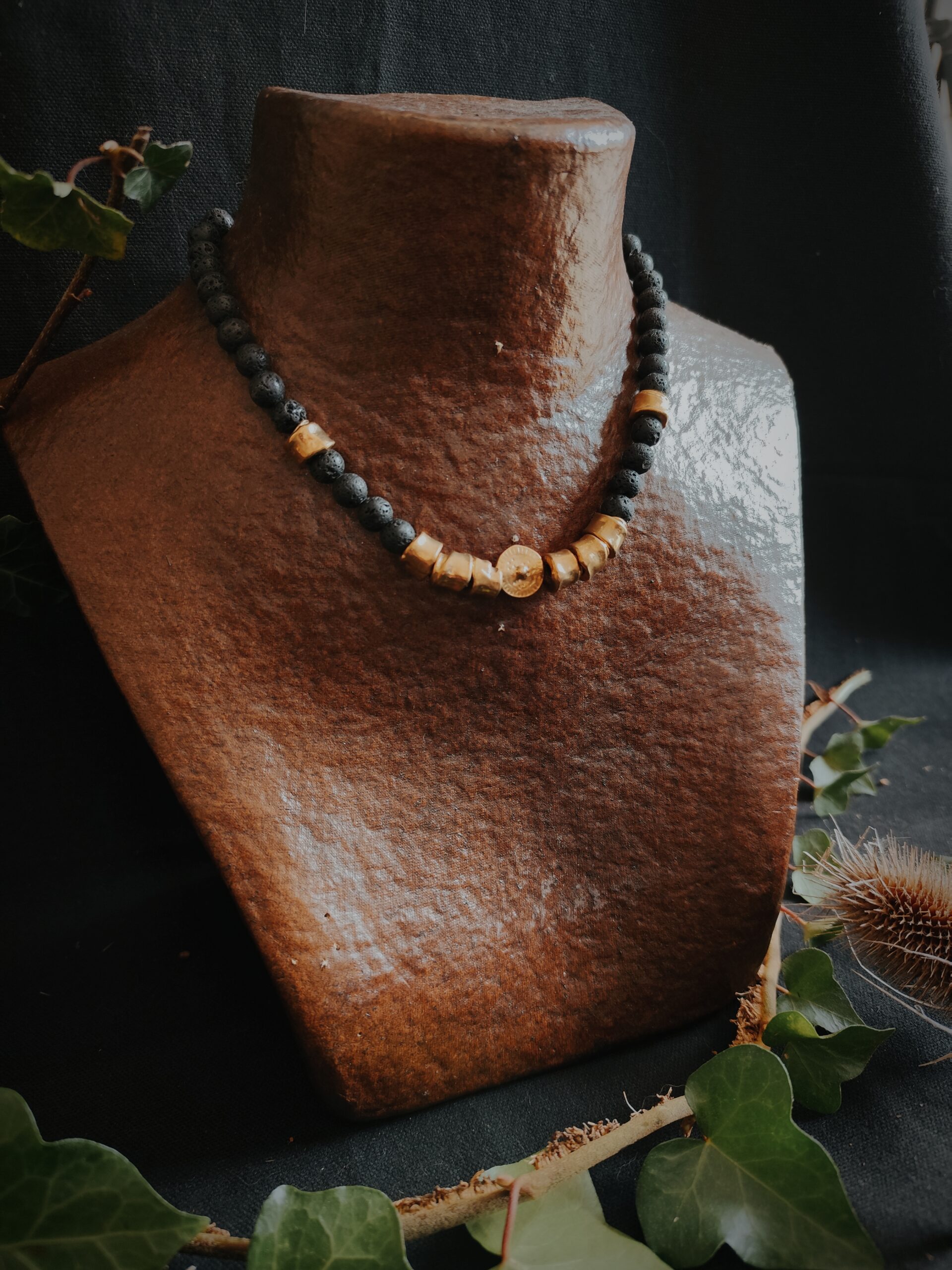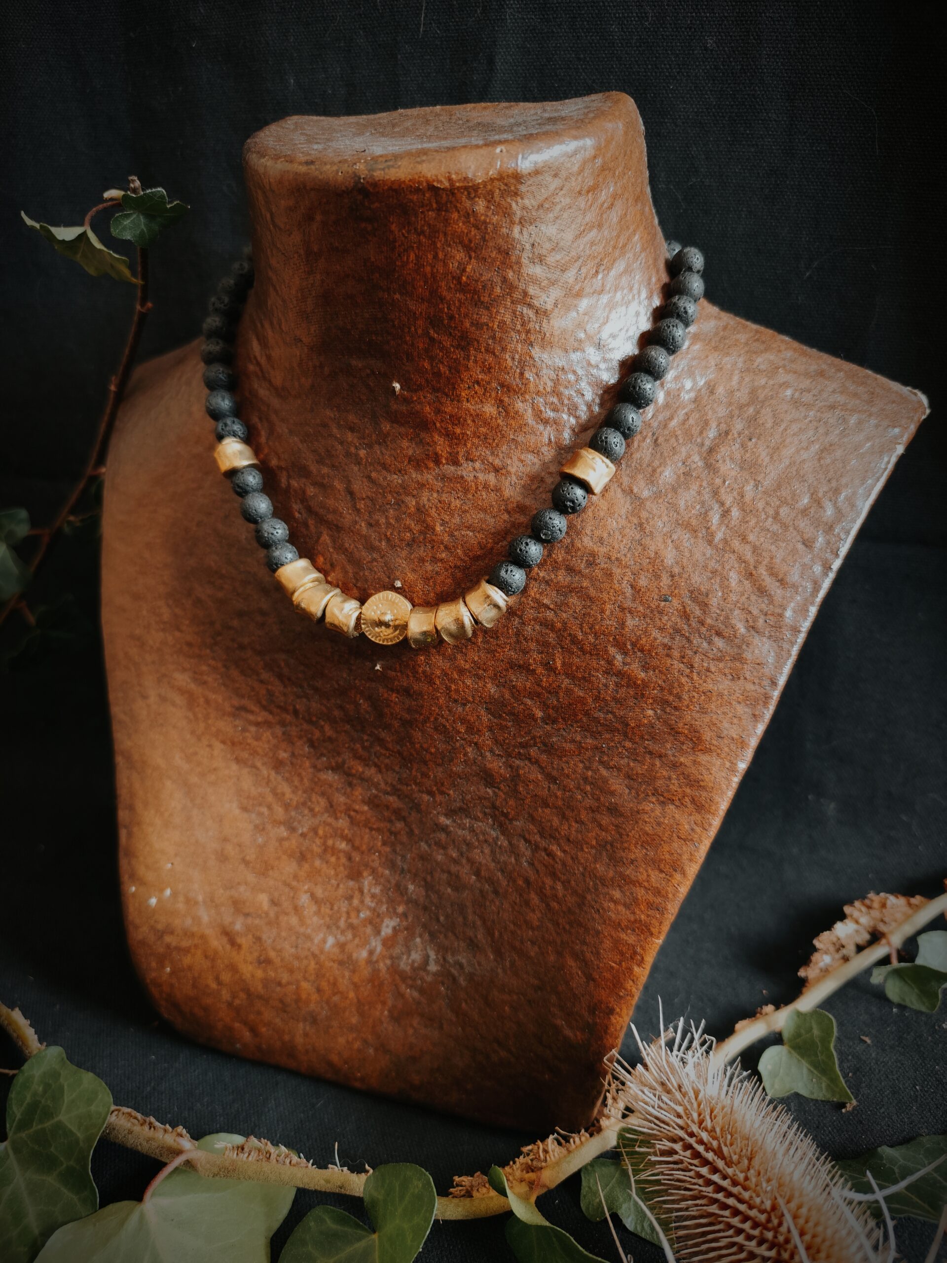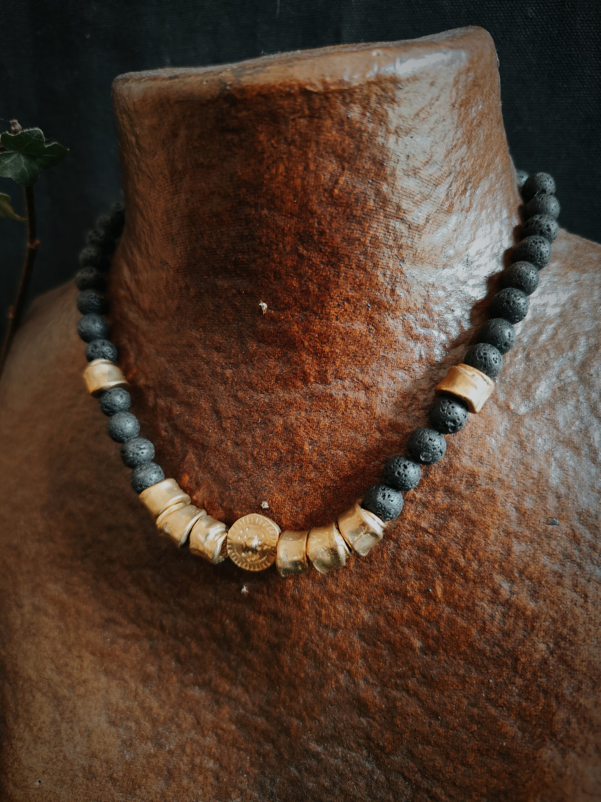 Collier en perles de Basalte (Pierre de lave) et perles de laiton.