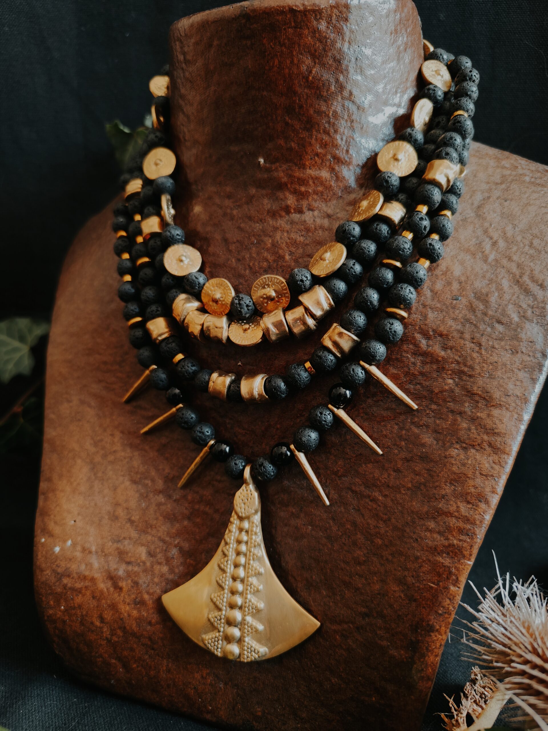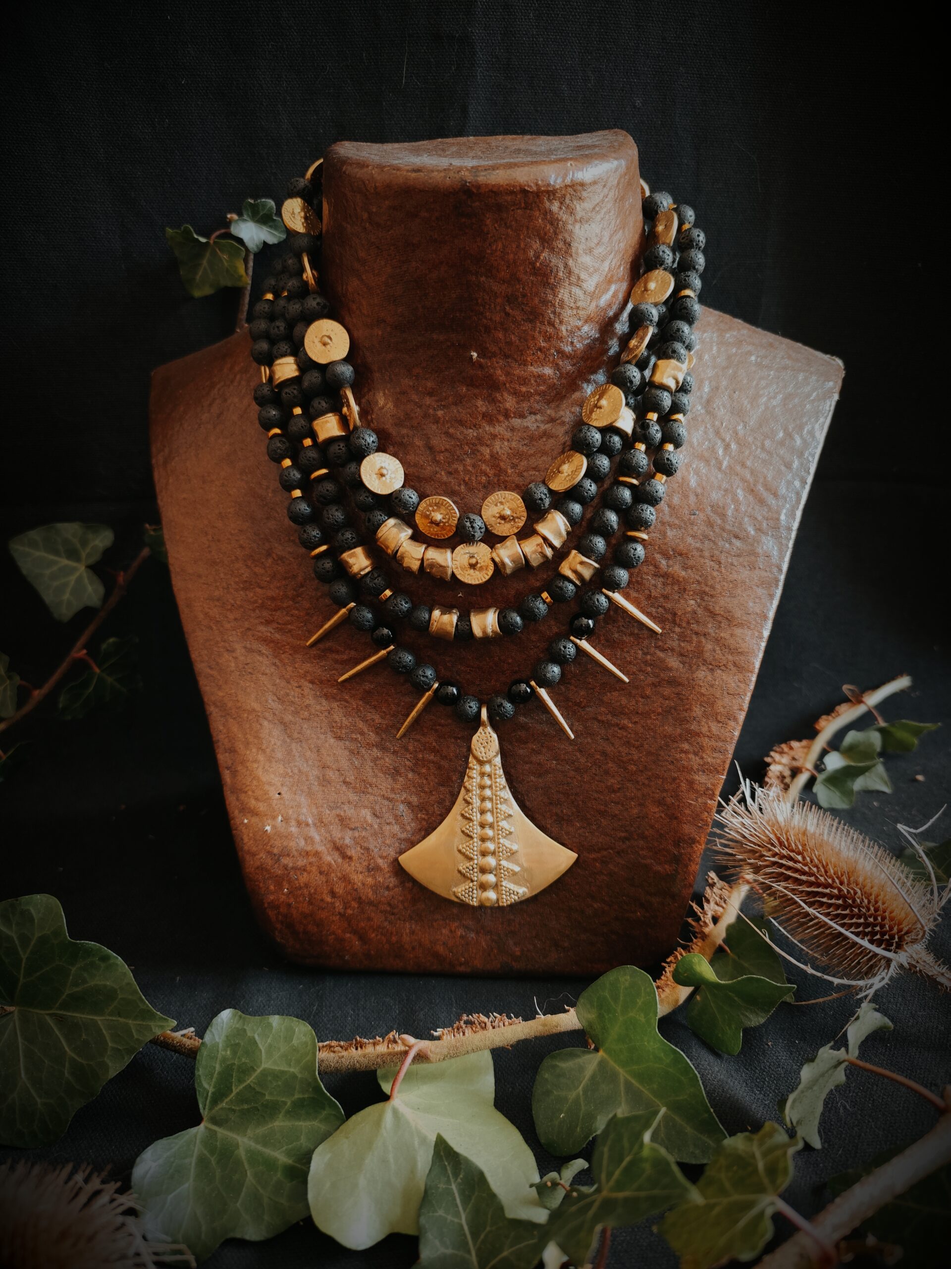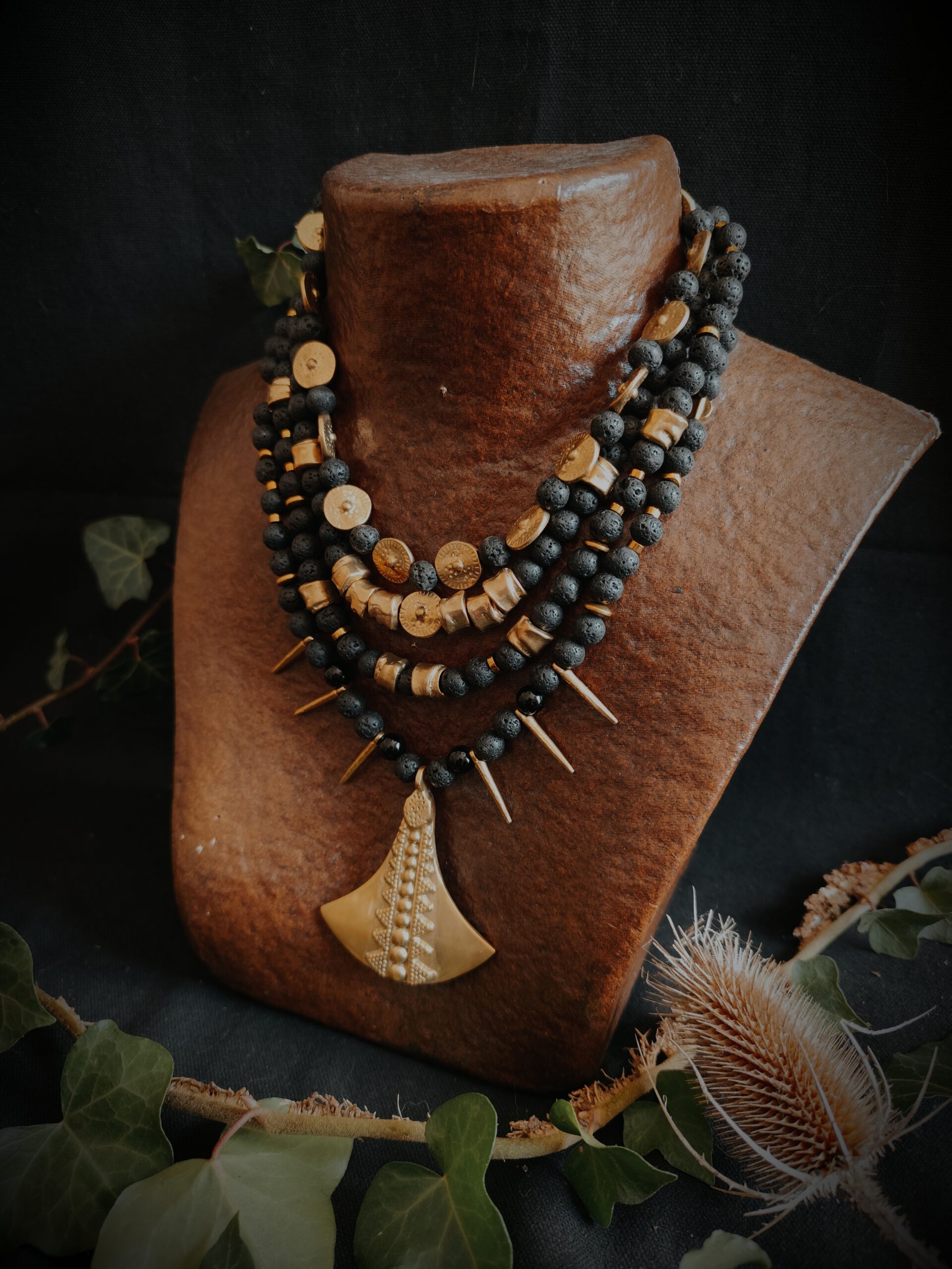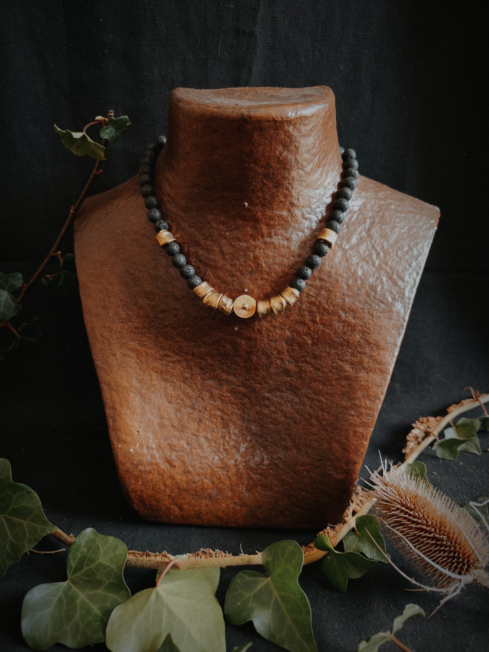 Collier en perles de Basalte (Pierre de lave) et perles de laiton.