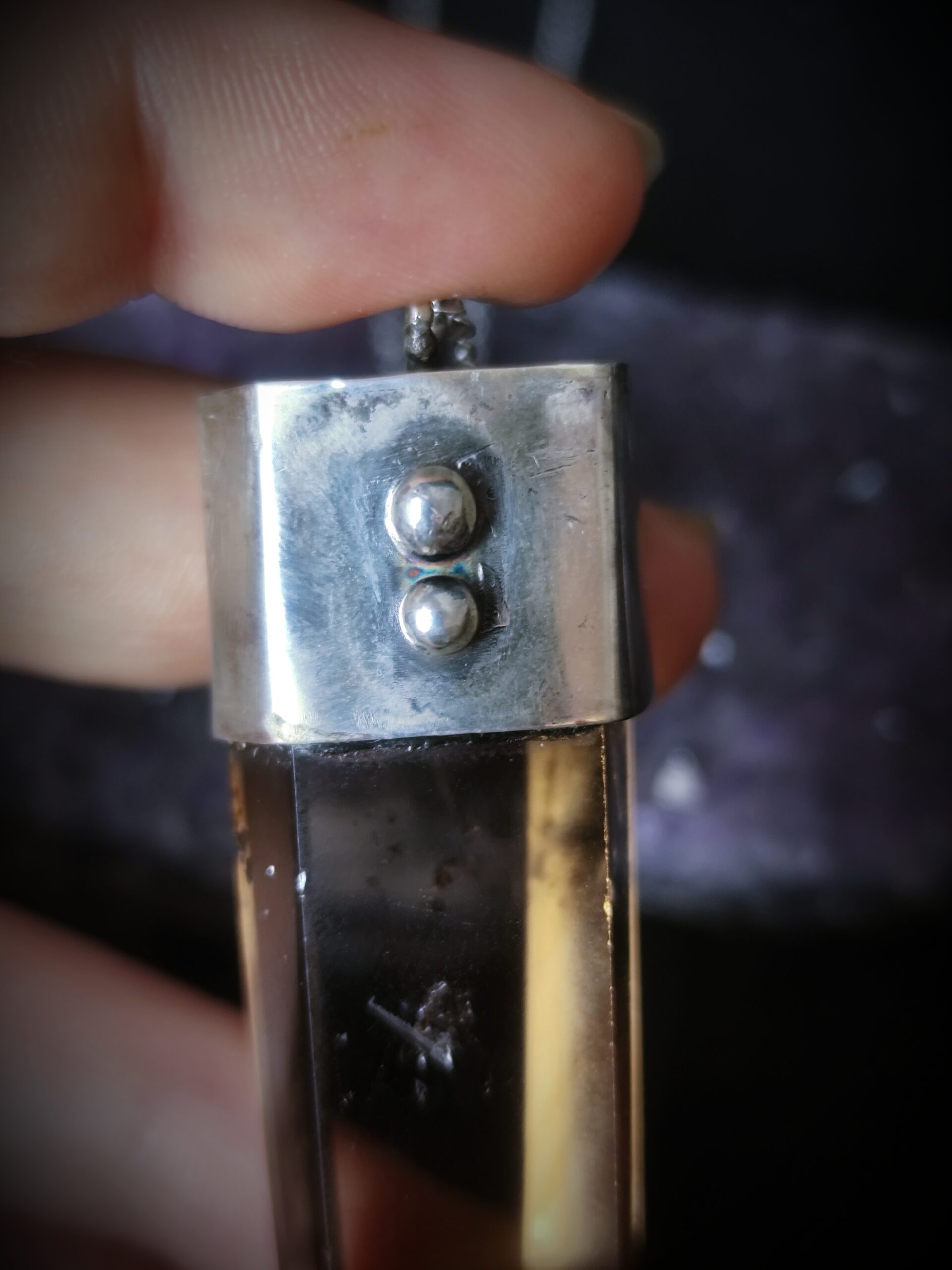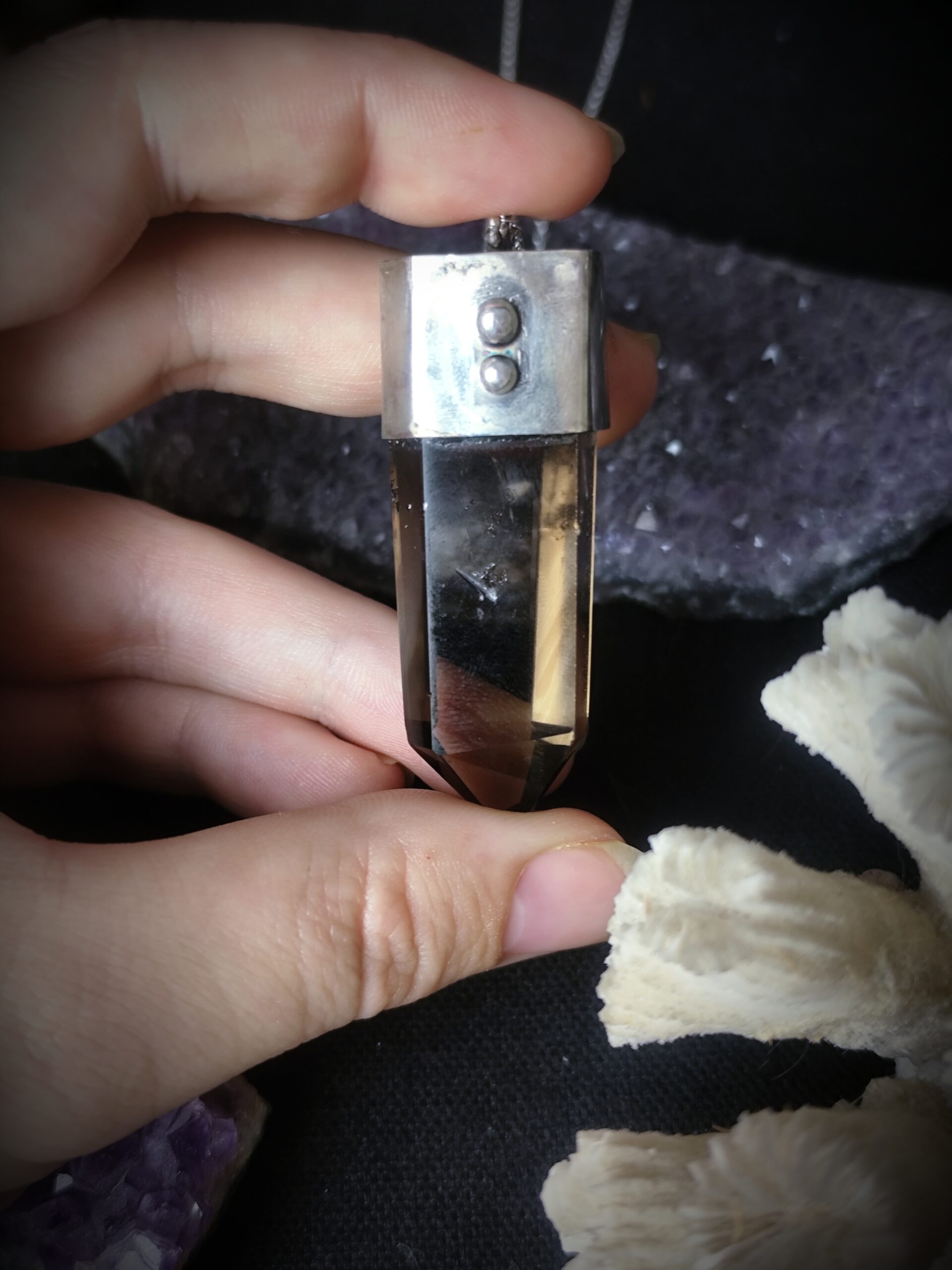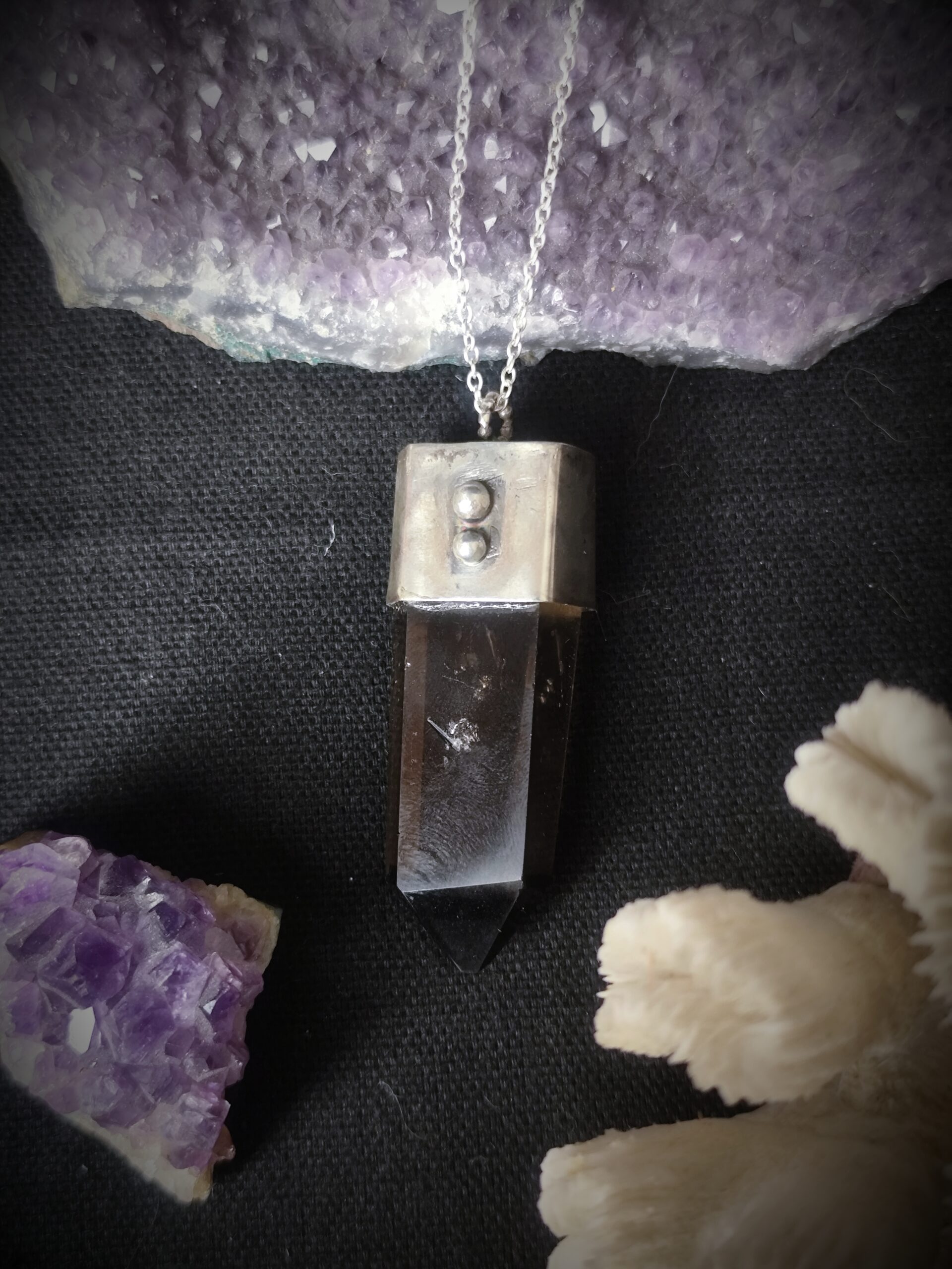 Umbra est un pendule-pendentif né pour t’accompagner dans les périodes de transformation et d’introspection. Son quartz fumé, à la fois puissant et apaisant, t’ancre profondément à la Terre tout en t’aidant à traverser les zones d’ombre sans peur. Sa pointe légèrement ébréchée en fait une pièce singulière : imparfait, il comprendra mieux que quiconque les failles et les forces de celle ou celui qui le portera. Elle symbolise les failles que nous portons tous, celles qui font partie de notre force et de notre lumière.